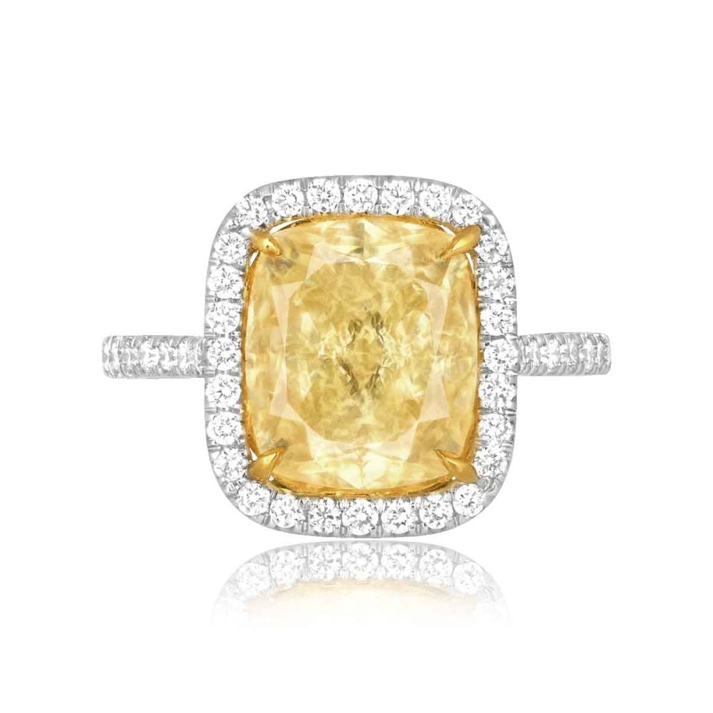 A stunning ring featuring a GIA certified 5.01 carat cushion cut center diamond with a fancy light yellow color and VS2 clarity. Surrounding the center stone is a halo of round brilliant cut diamonds leading to additional diamonds set halfway down the shank. The additional diamonds weigh a total of 0.52 carats. This ring is made in platinum and 18k yellow gold.
