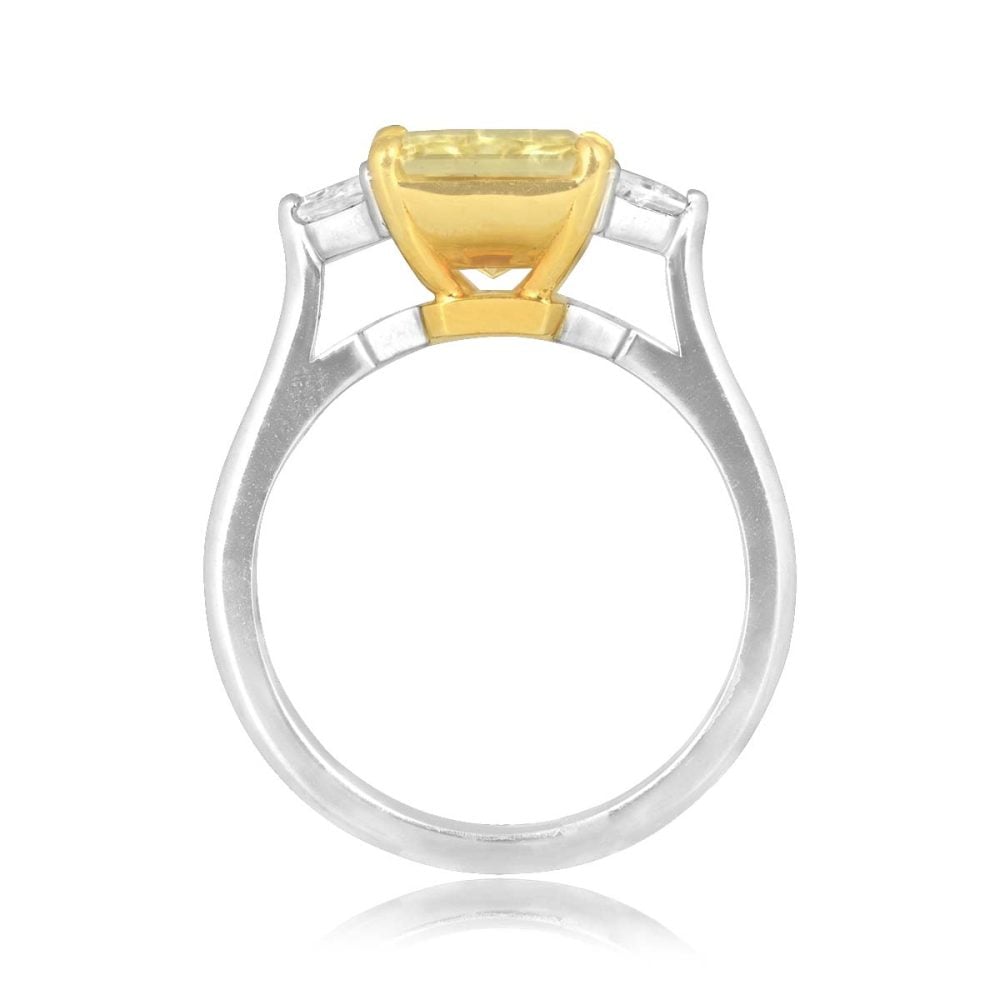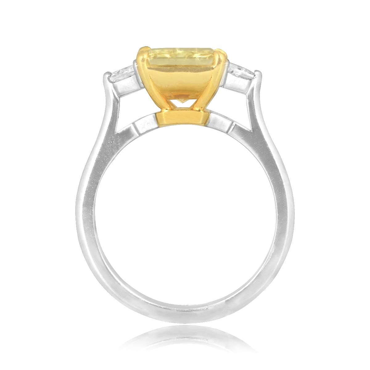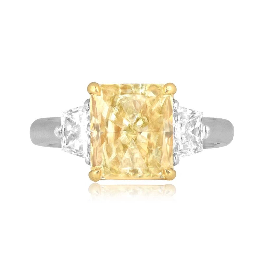 This ring centers a GIA certified 3.00 carat radiant cut fancy yellow diamond with a VS2 clarity. Accenting the center diamond are two trapezoid diamonds weighing a total of 0.50 carats with a D color and VS clarity. This ring is made in platinum and 18k yellow gold.