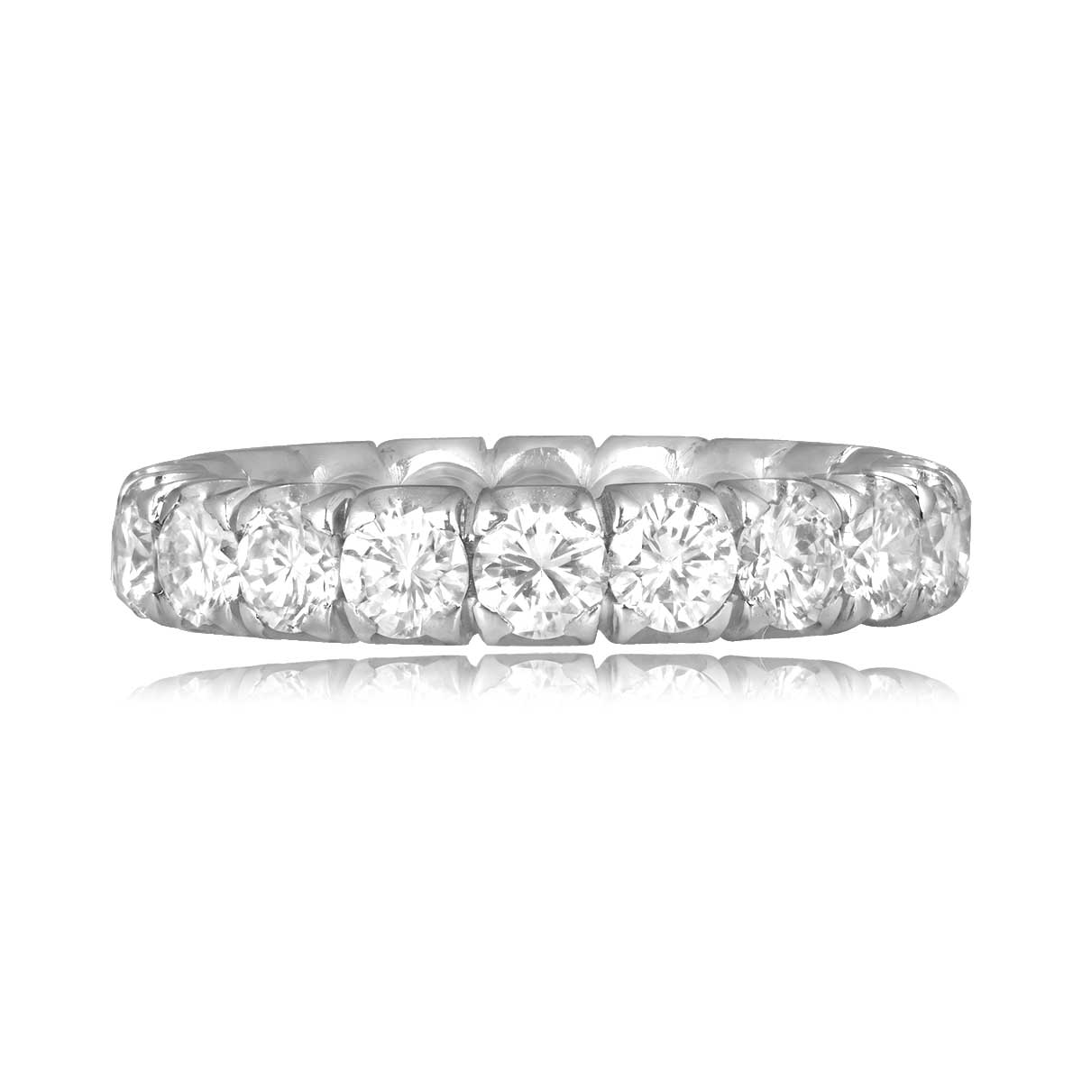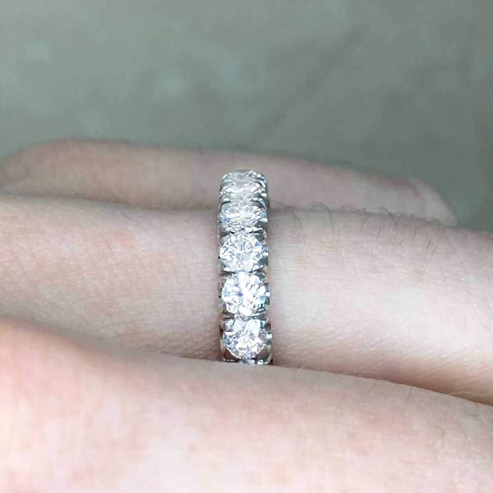 A vintage eternity wedding band featuring round brilliant and transitional cut diamonds set in prongs. The diamonds weigh a total of 2.40 carats with an overall H color and VS1 clarity. This band was made in 18k white gold, circa 1960.