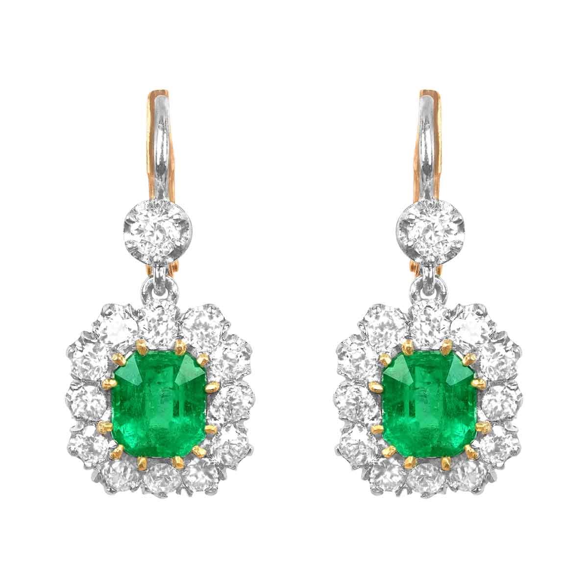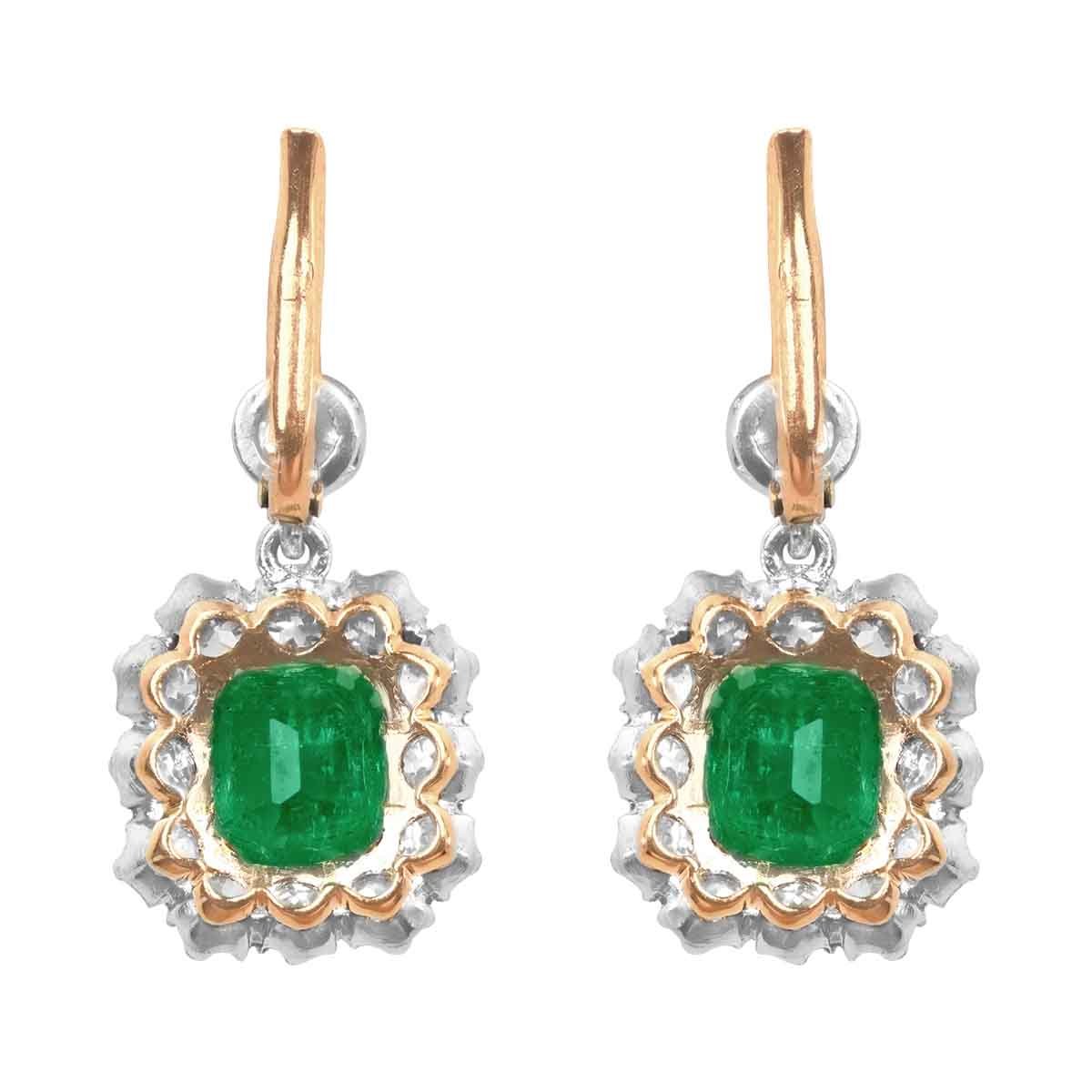 These pair of earrings feature a floral design centering prong-set emerald cut emerald stones weighing a total of 2.44 carats. Surrounding the center stones are clusters of old European cut diamonds. An additional diamond is prong-set at the top section of each earring. The diamonds weigh a total of 1.80 carats. These earrings are made in platinum and 18k yellow gold.