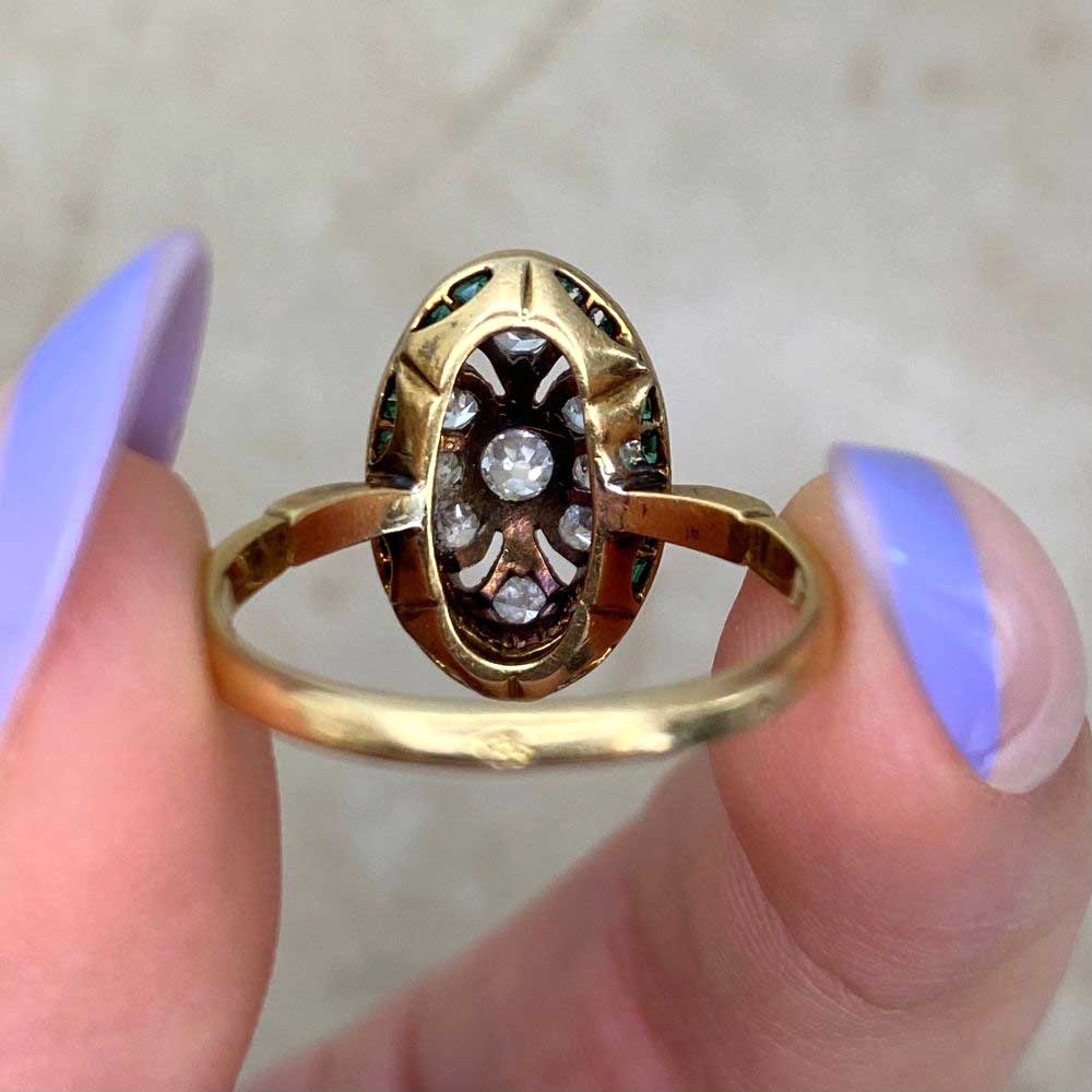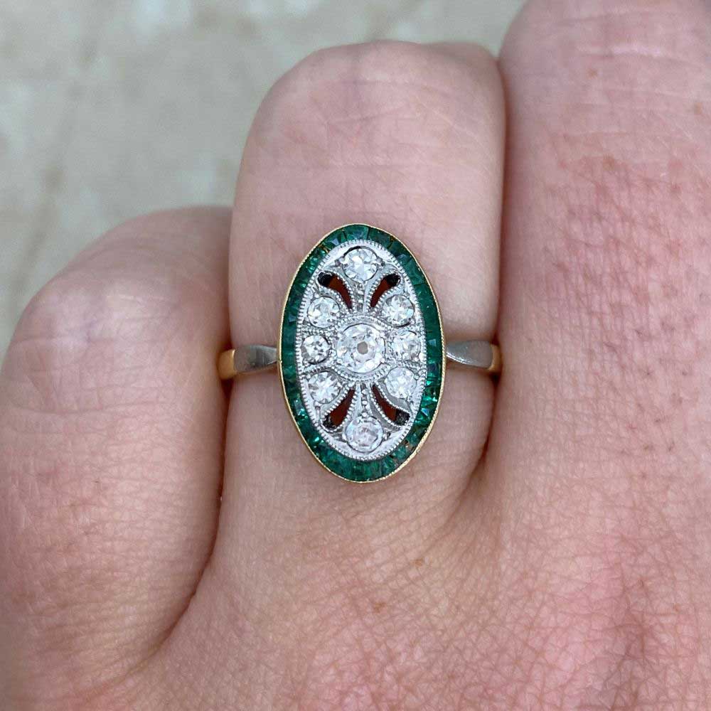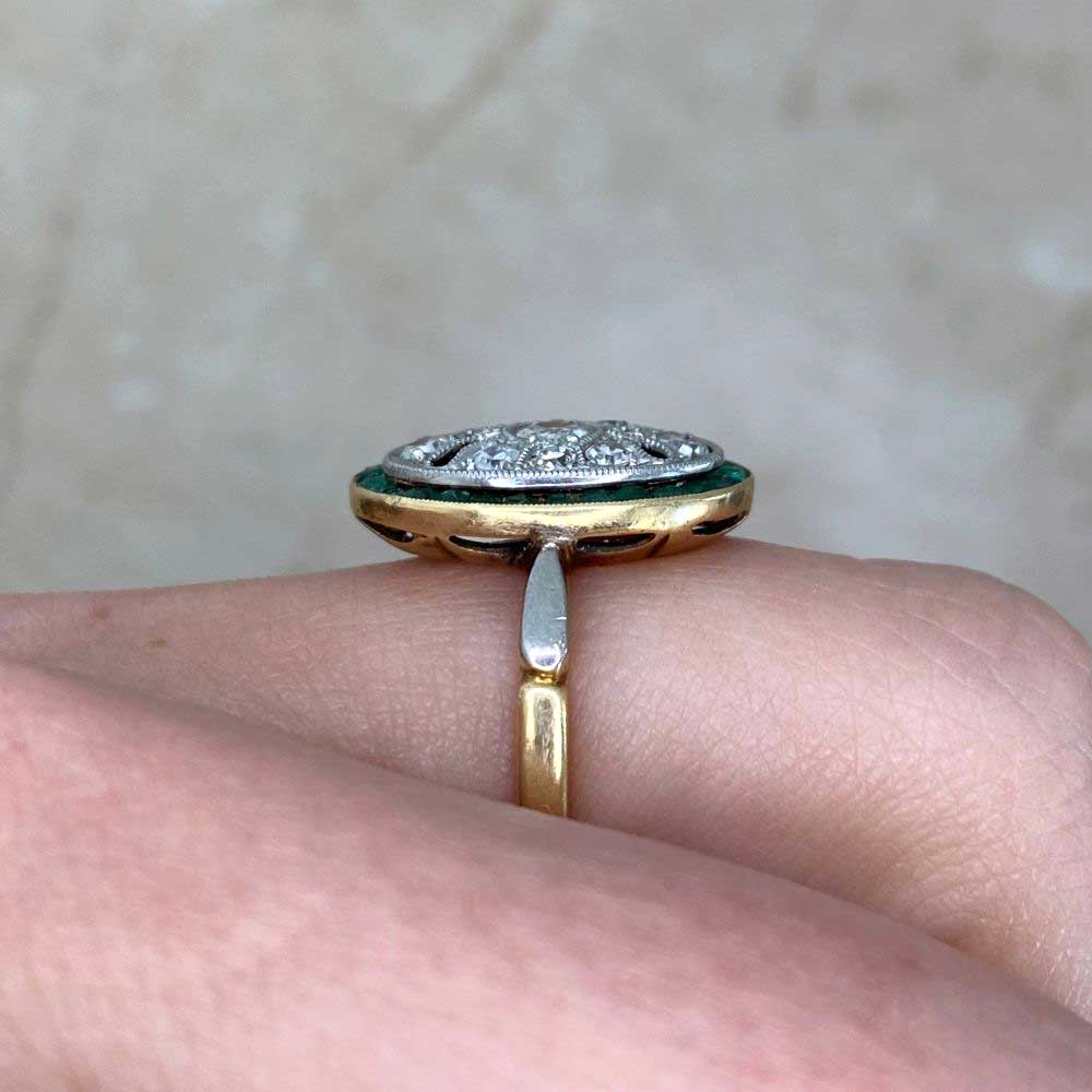 This French Edwardian era ring features an elongated filigree design adorned with diamonds and milgrain detailing. The total diamond weight is approximately 0.29 carats. A halo of channel-set emeralds surrounds the filigree. This ring was handcrafted in platinum on 18k yellow gold, circa 1910.