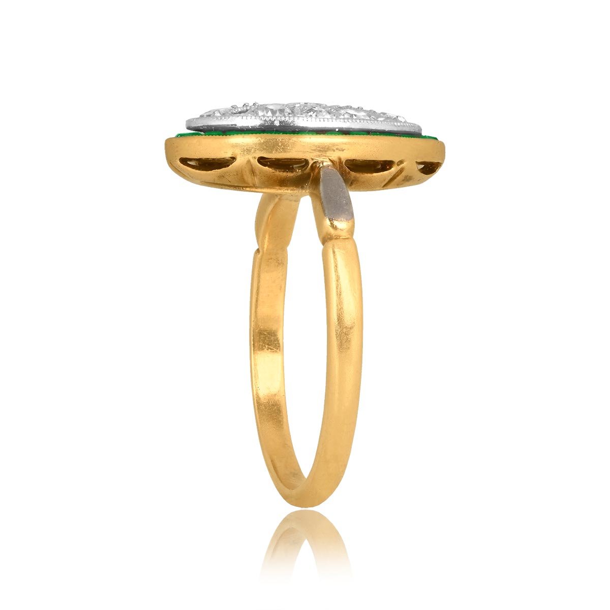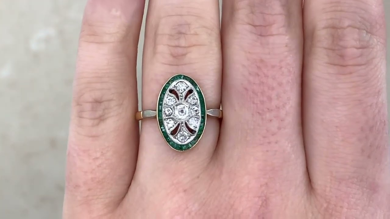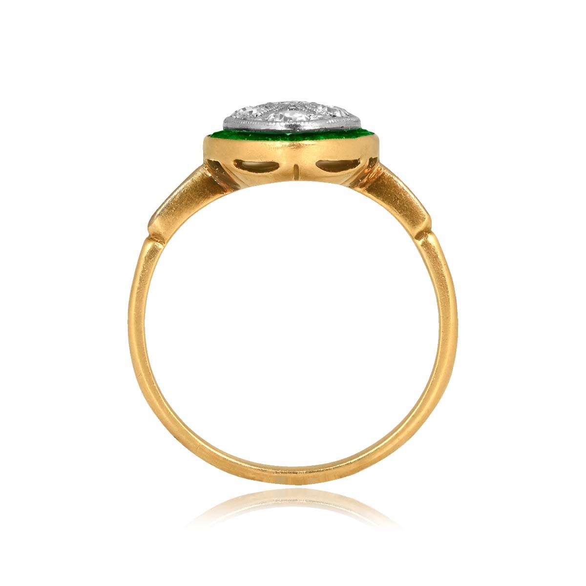 This French Edwardian era ring features an elongated filigree design adorned with diamonds and milgrain detailing. The total diamond weight is approximately 0.29 carats. A halo of channel-set emeralds surrounds the filigree. This ring was handcrafted in platinum on 18k yellow gold, circa 1910.