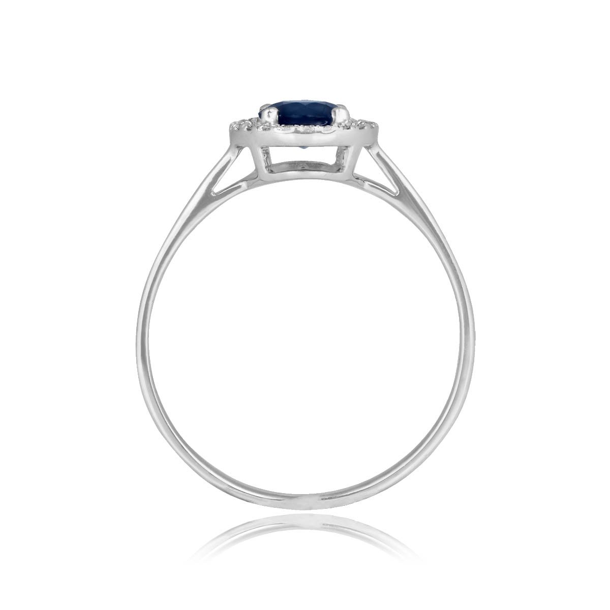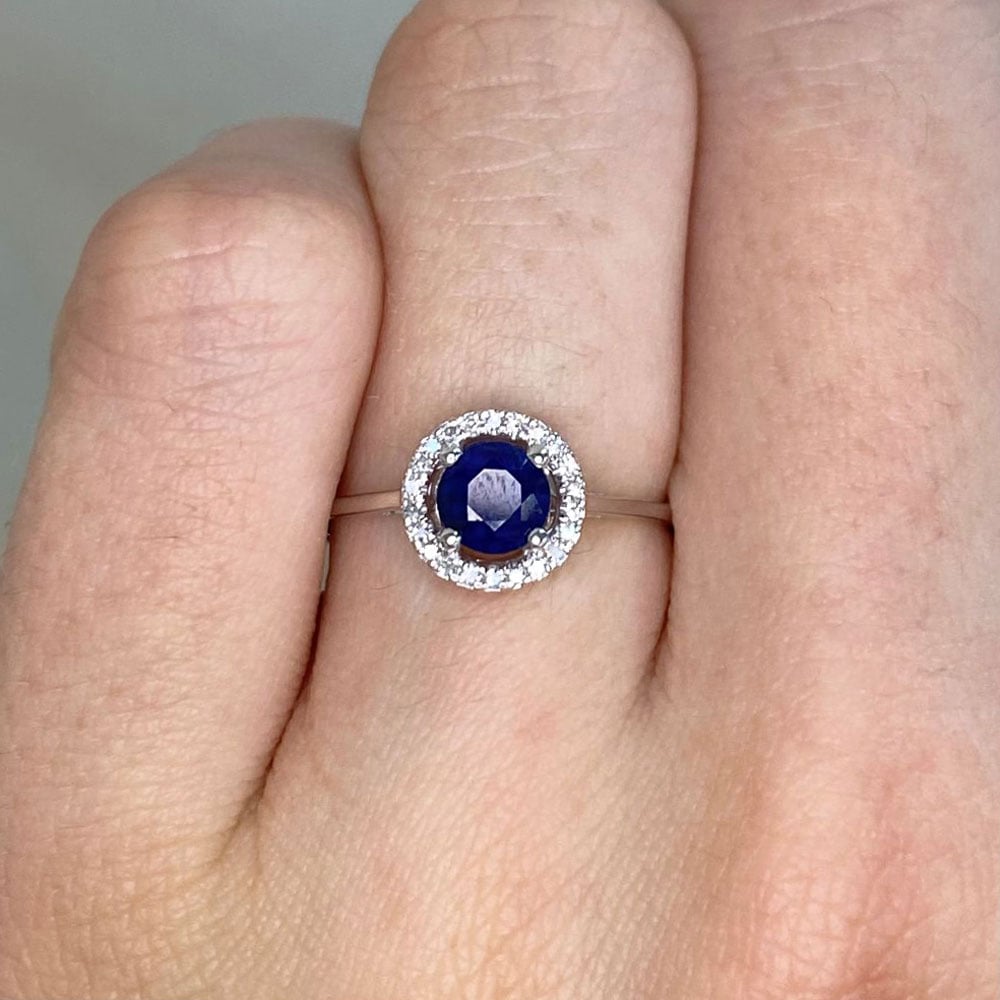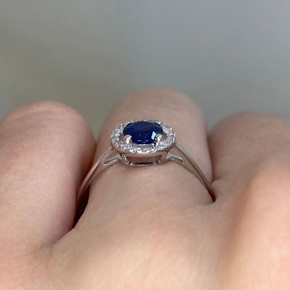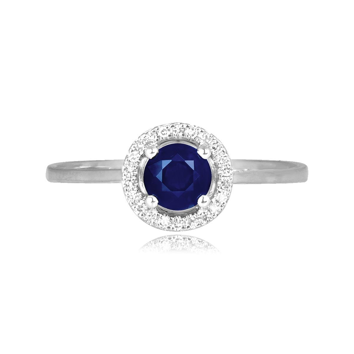 This ring centers a 0.59 carat round sapphire stone set in a prong setting. Surrounding the center stone is a halo of round diamonds weighing a total of approximately 0.07 carats. This ring is handcrafted in 14k white gold.