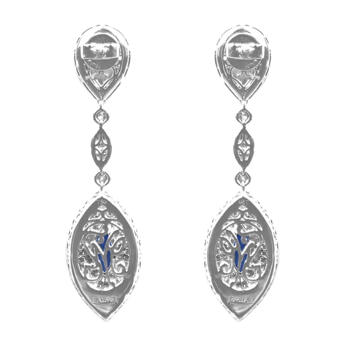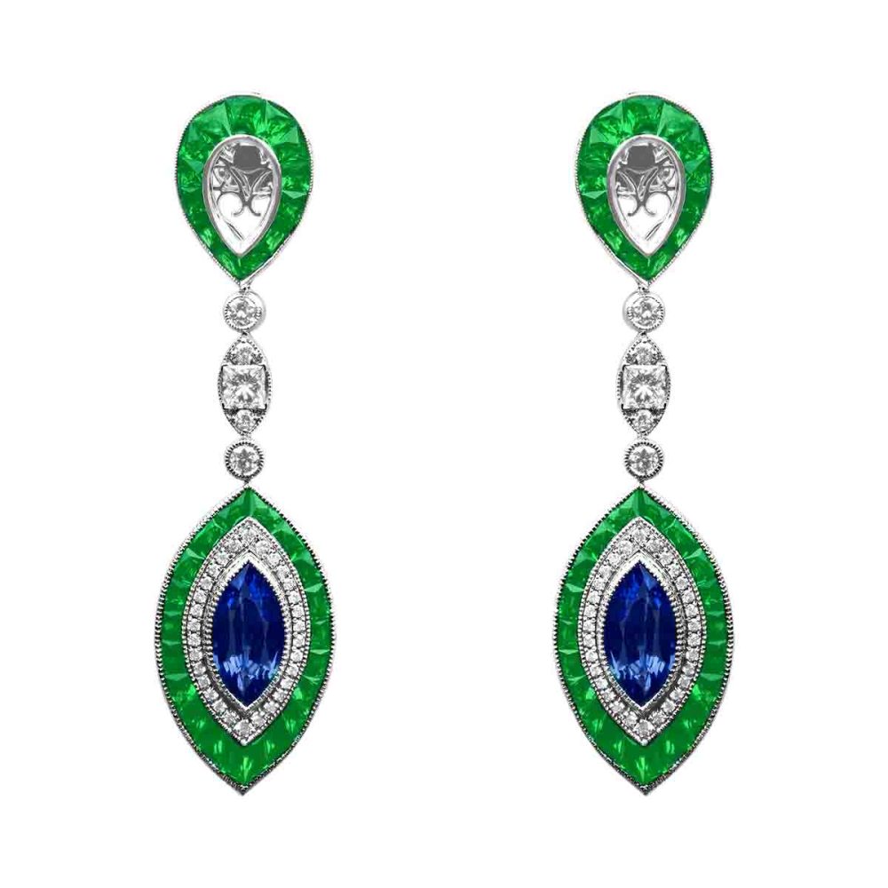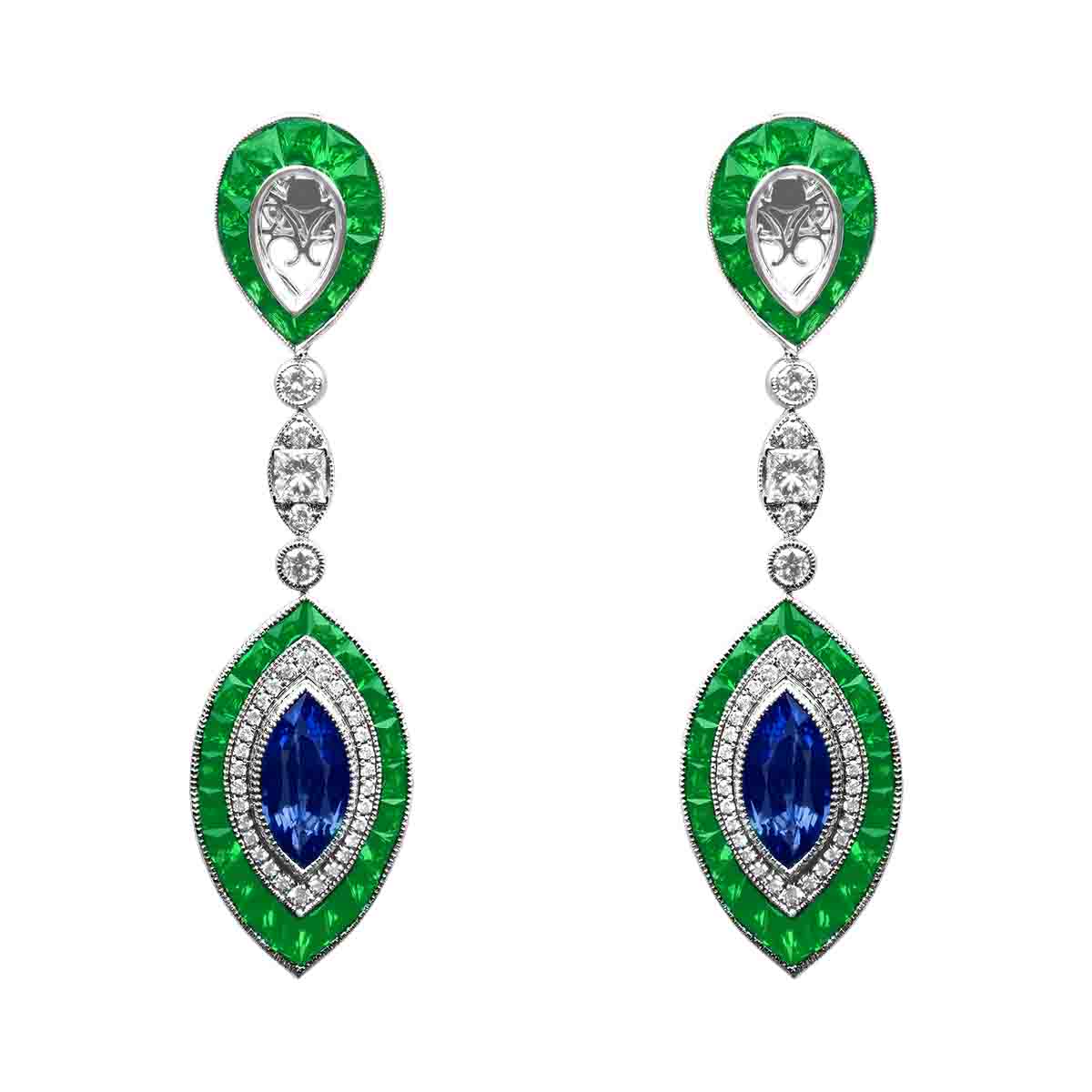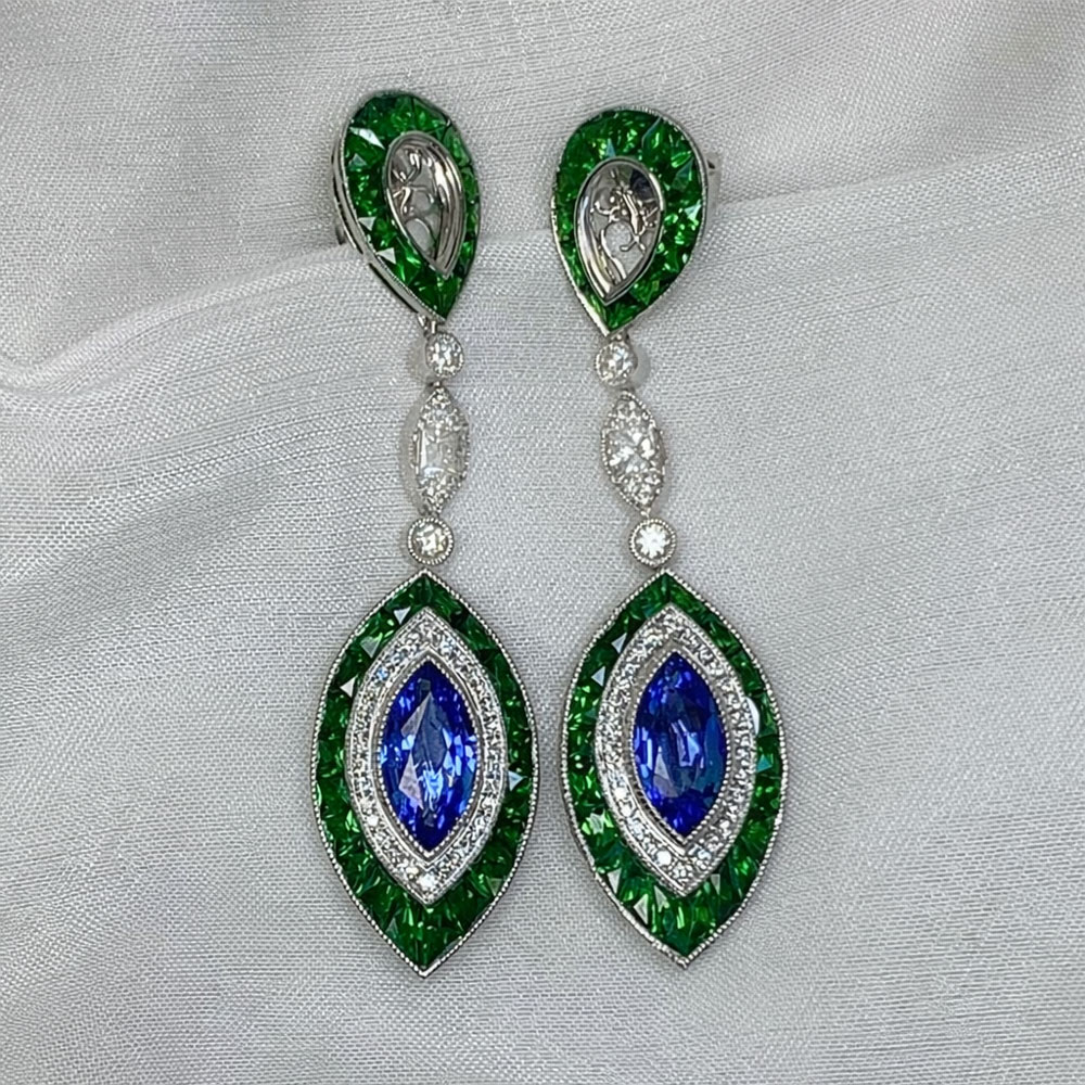 A beautiful pair of earrings featuring sapphire, tsavorite and diamonds stones. The top section of these earrings feature a pear shaped frame of French cut tsavorite stones. A unique pattern of mixed shape diamonds lead to an elongated marquise shaped drop on the lower section of the earrings. Centering the lower drop is a marquise cut sapphire stones weighing a total of 2.46 carats. Surrounding the sapphire is a double halo of additional diamond and tsavorite stones. The tsavorite stones weigh a total of 4.86 carats and the diamonds weigh a total of 0.61 carats. These earrings are made in 18k white gold.