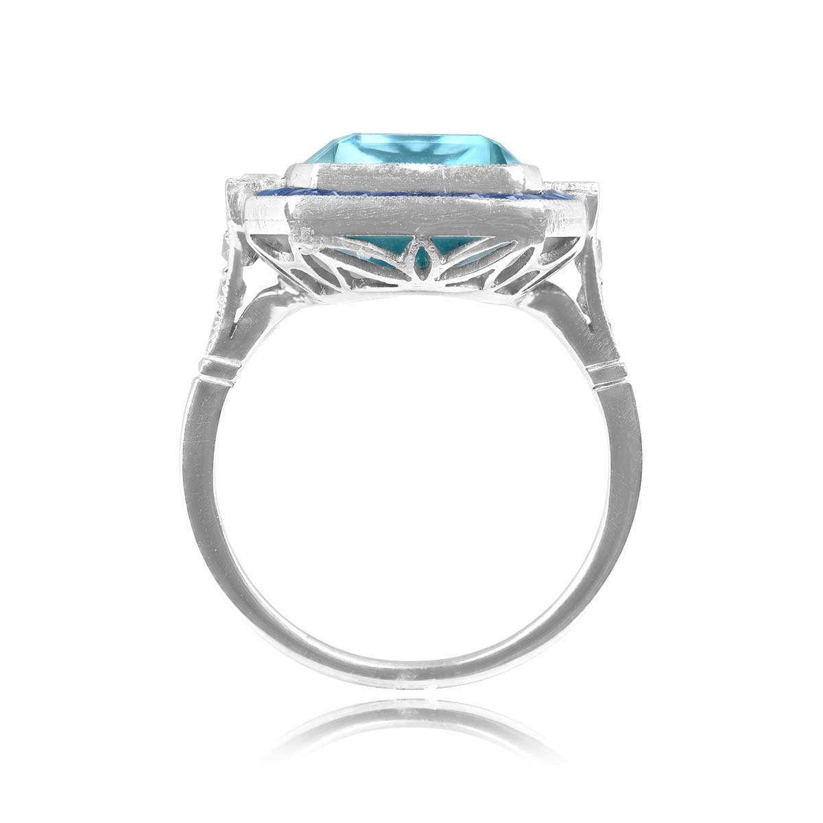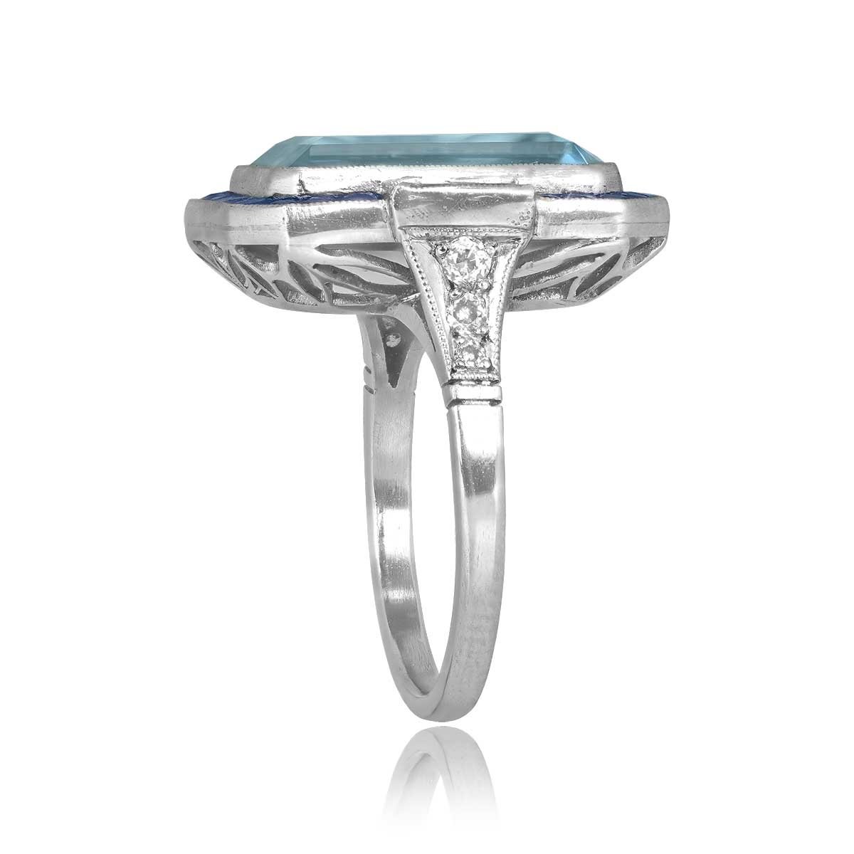 A Word from the Jeweler: This Art Deco ring’s bold geometric design really captures the essence of the era. The striking combination of the light blue aquamarine and dark blue sapphire, along with the large size of the aquamarine center stone, makes this ring a statement piece.