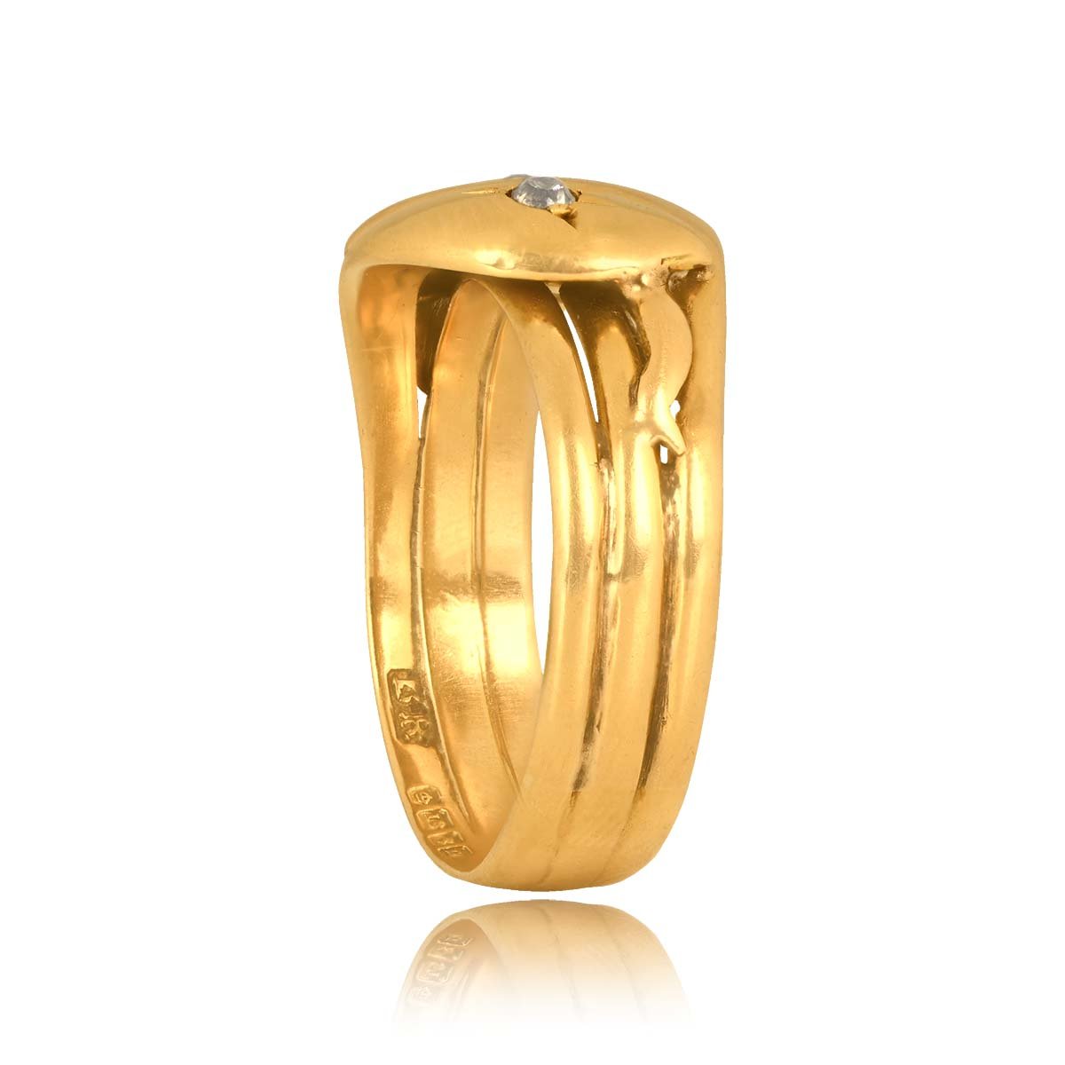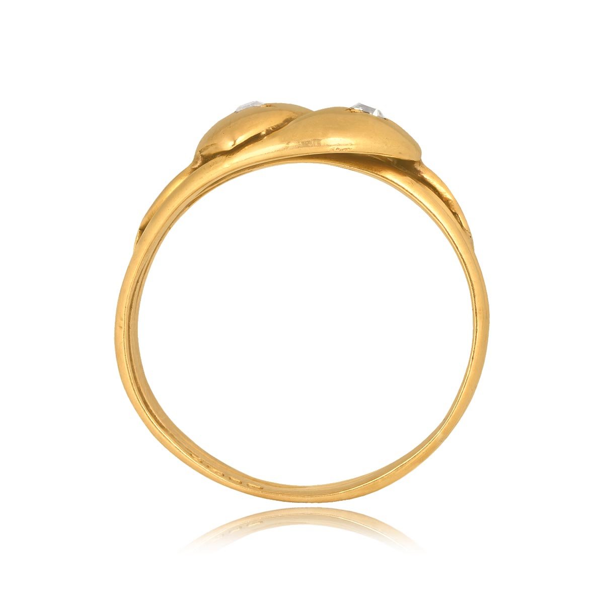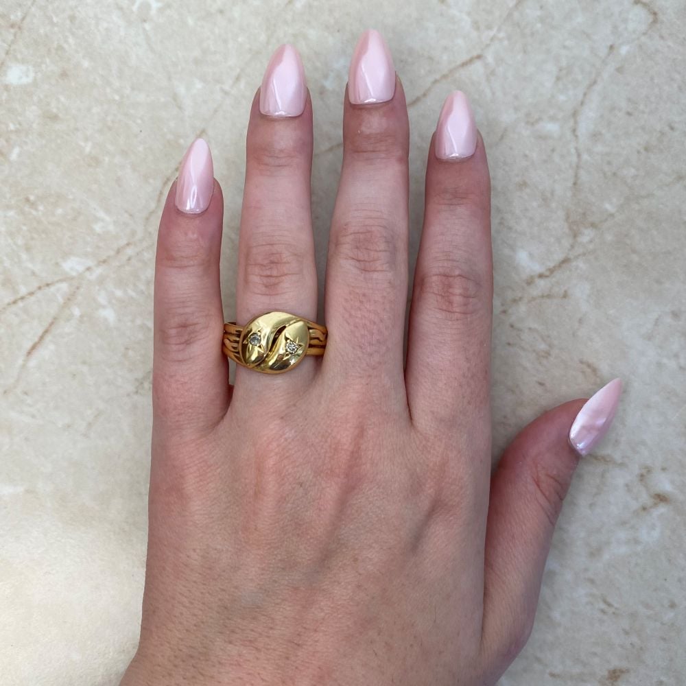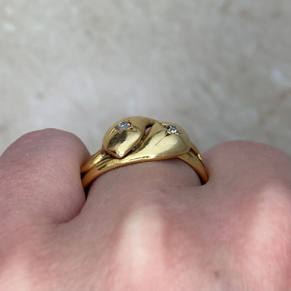 A unique English Victorian era band featuring a double head snake design. The heads are adorned with two prong-set diamonds weighing a total of approximately 0.14 carats. The band showcases a triple-wire shank design. This band was handcrafted in 18k yellow gold, circa 1890s.