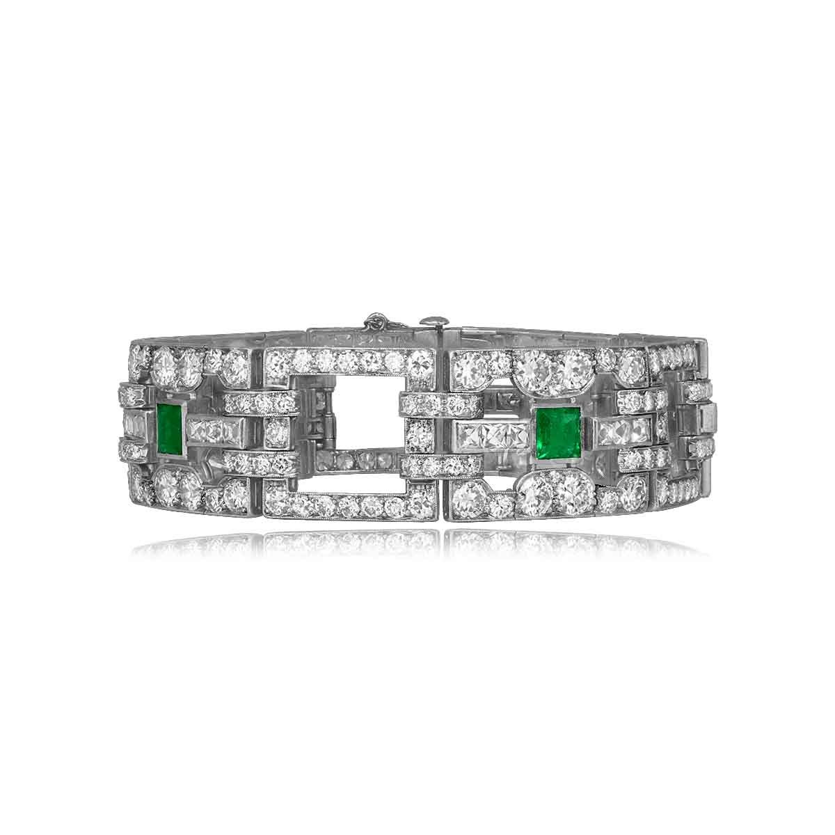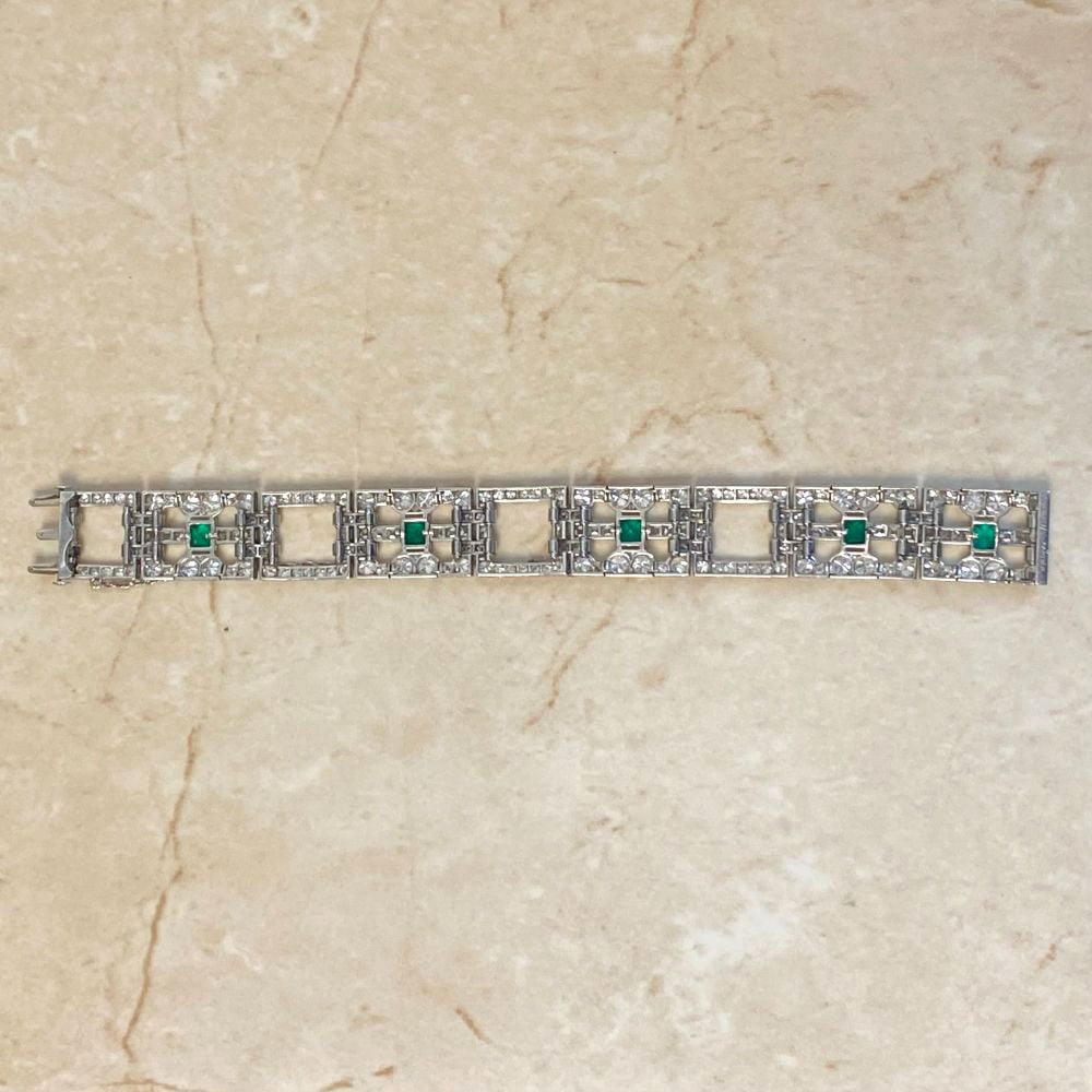 A Word from the Jeweler: I was immediately drawn to the bold geometric link design which perfectly embodies the refined symmetry that Cartier mastered during the Art Deco era. The vibrant emeralds add such an elegant contrast to the diamonds, giving this bracelet a distinct and timeless appeal.