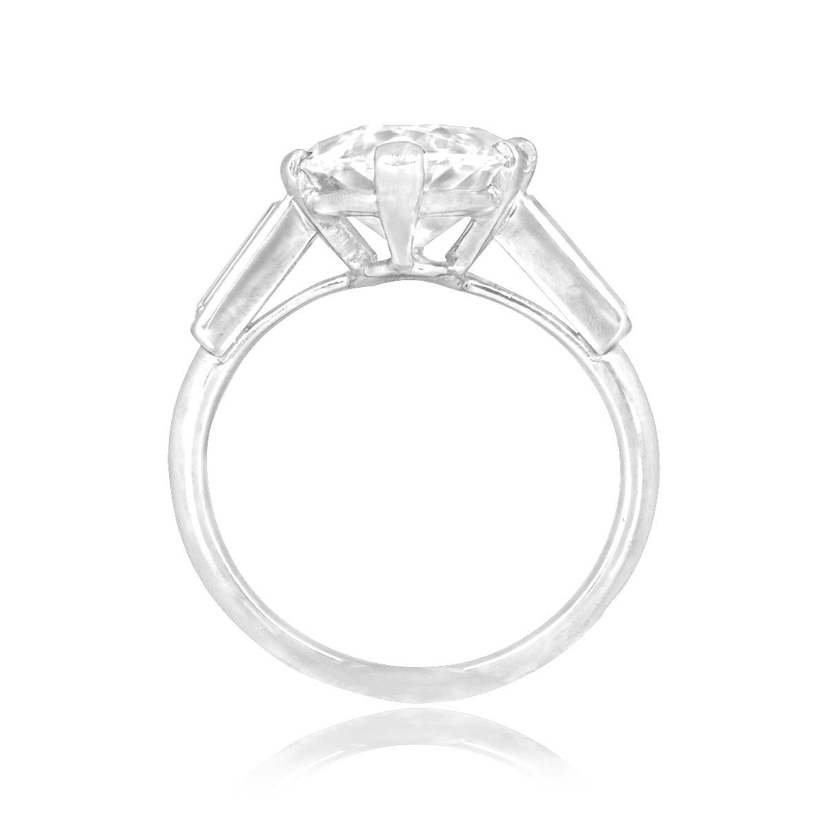A gorgeous vintage Cartier France platinum engagement ring featuring a GIA certified 4.97 carat antique marquise cut center diamond with an E color and VS1 clarity. Accenting the center diamond are two baguette shaped diamonds weighing a total of approximately 0.72 carats. This ring is signed and numbered Cartier, circa 1950.