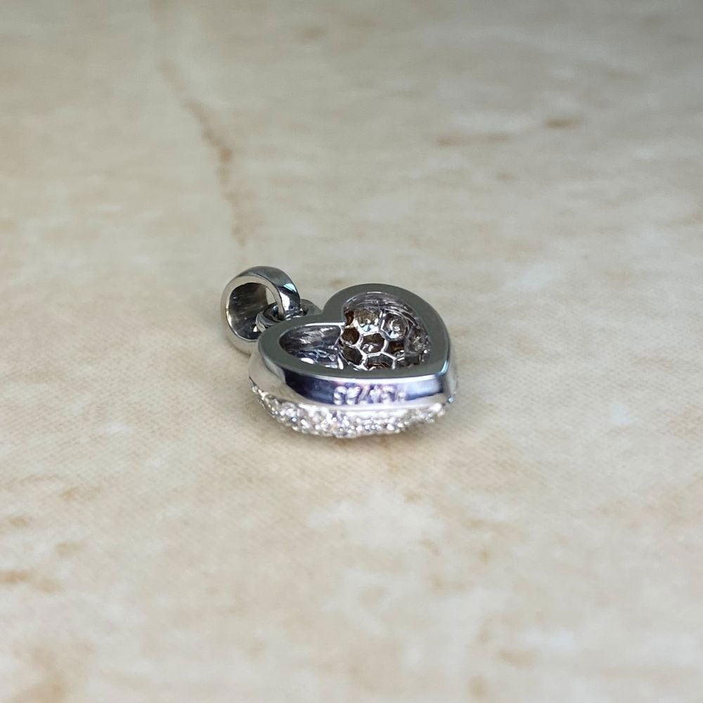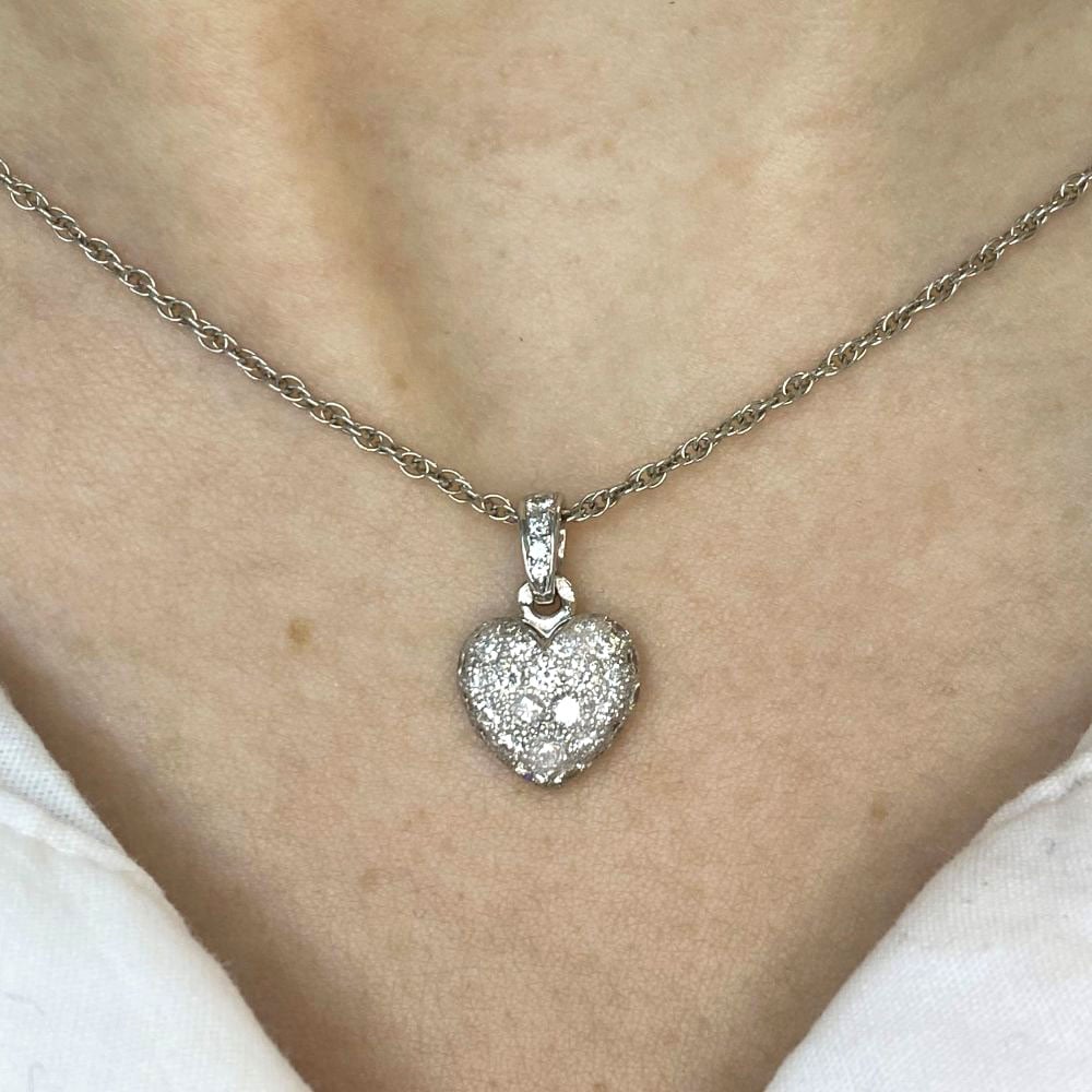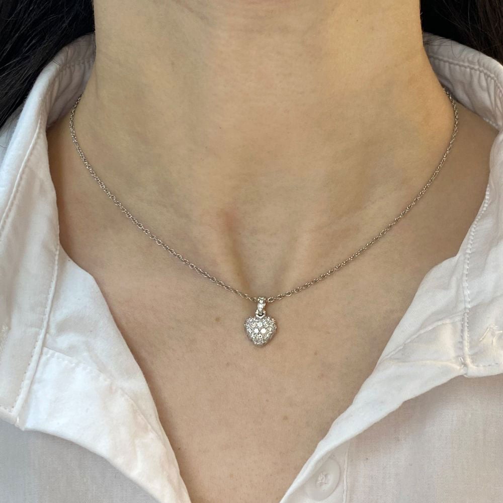 This Cartier signed heart shaped pendant is decorated with pave-set round brilliant diamonds. Four round brilliant diamonds are also set along the loop of the pendant. The total diamond weight is approximately 0.66 carats. This pendant was handcrafted in 18k white gold.