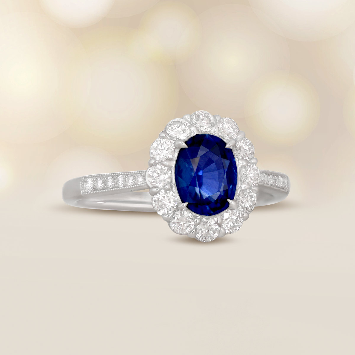 A stunning cluster ring featuring a 1.10 carat oval-cut natural sapphire, set in prongs. The sapphire is surrounded by a halo of round brilliant cut diamonds, also set in prongs. Adorning the shoulders of the shank are additional round brilliant cut diamonds that are micro-pave set. Fine milgrain and an openwork under-gallery decorate the platinum mounting.