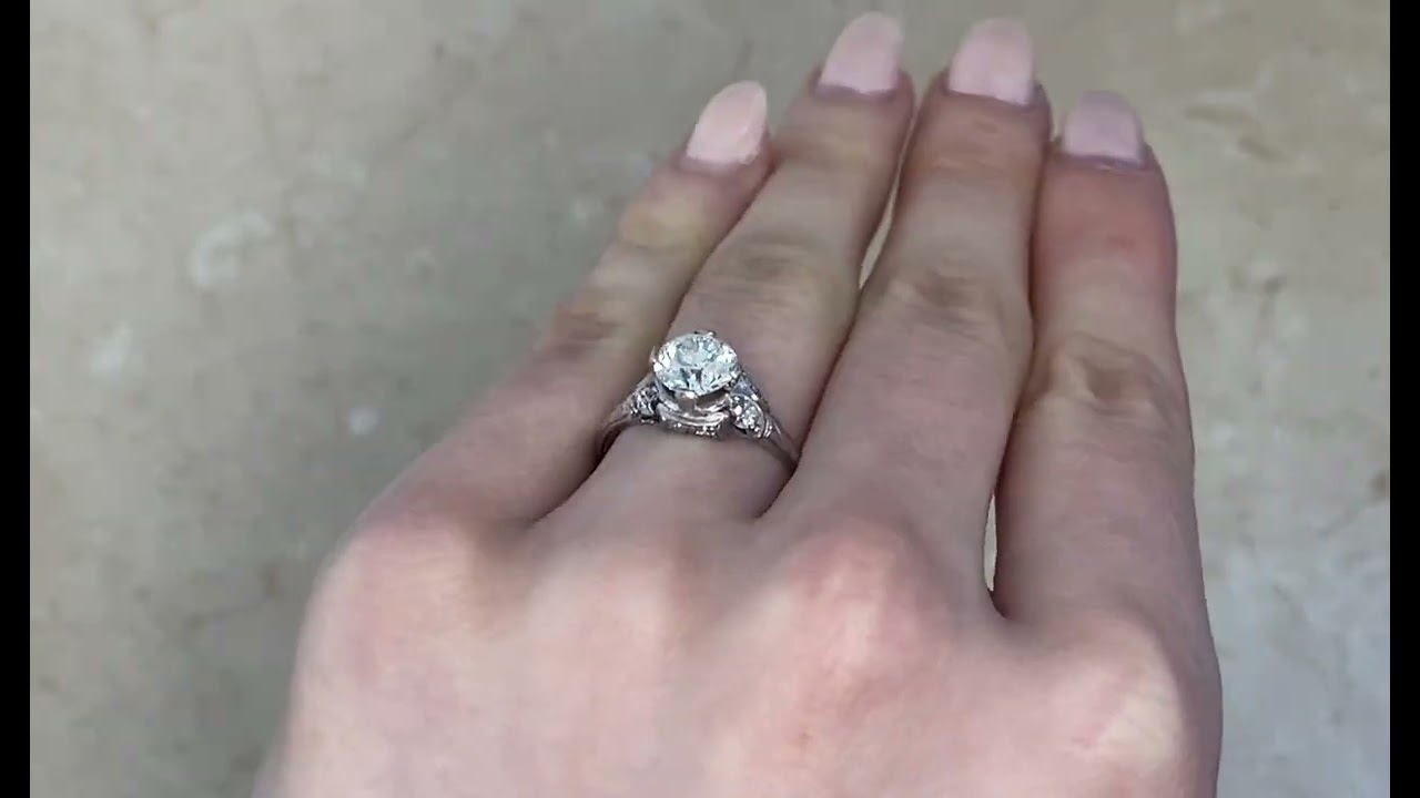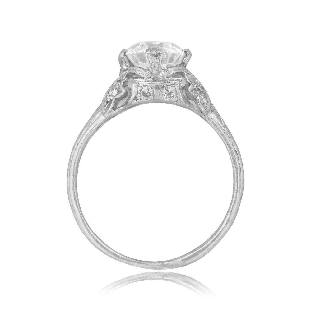 A beautiful Art Deco ring centering a GIA certified 1.43 carat old European cut diamond with a J color and VS1 clarity. The under-gallery and shoulders of this ring feature intricate filigree designs adorned with additional diamonds. The shank is decorated with hand engravings. This ring was crafted in platinum, circa 1920.