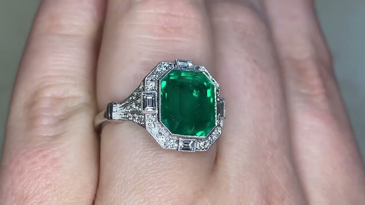 A geometric emerald and diamond halo ring that features a 3.88 carat natural Zambian emerald. The emerald is emerald-cut and bezel-set. Surrounding the gemstone is a halo of round brilliant and baguette cut diamonds. Along the shoulders are three rows of round brilliant cut diamonds. The total diamond weight of this ring is approximately 0.62 carats. This ring is handcrafted in platinum, decorated with an openwork under-gallery and fine milgrain.