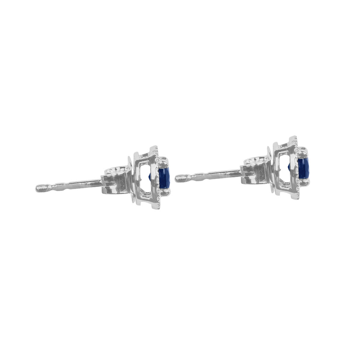 These stud earrings feature a center round cut sapphire stone set in a prong setting. The sapphires weigh a total of 0.54 carats. Surrounding the sapphire stone is a a halo of diamonds weighing a total of 0.10 carats. These earrings were made in 14k white gold.