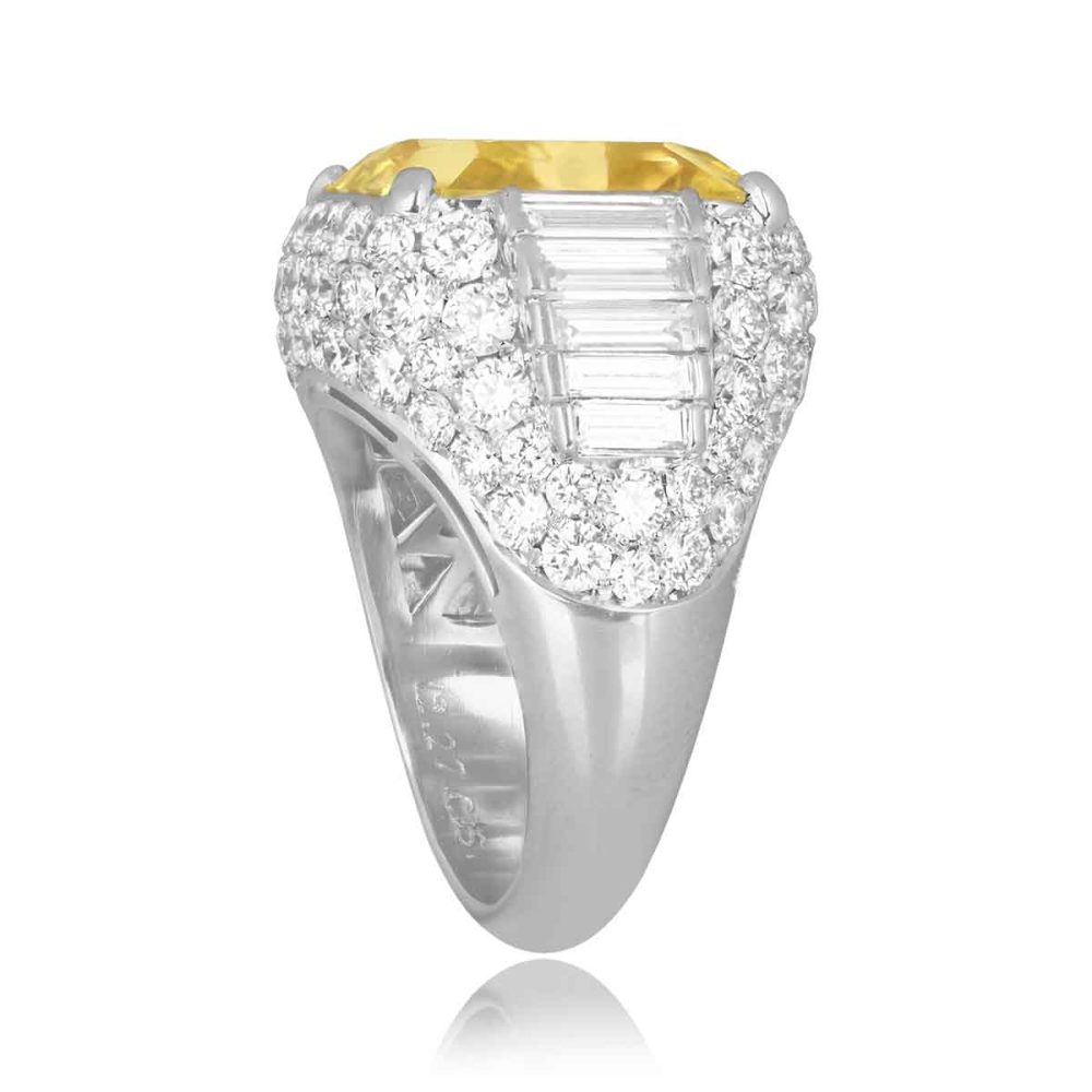 A stunning ring showcasing a GIA certified 12.27 carat fancy intense yellow radiant-cut diamond with a VVS2 clarity. Round brilliant and baguette cut diamonds accent the center stone weighing a total of approximately 1.25 carats. This ring is crafted in platinum.