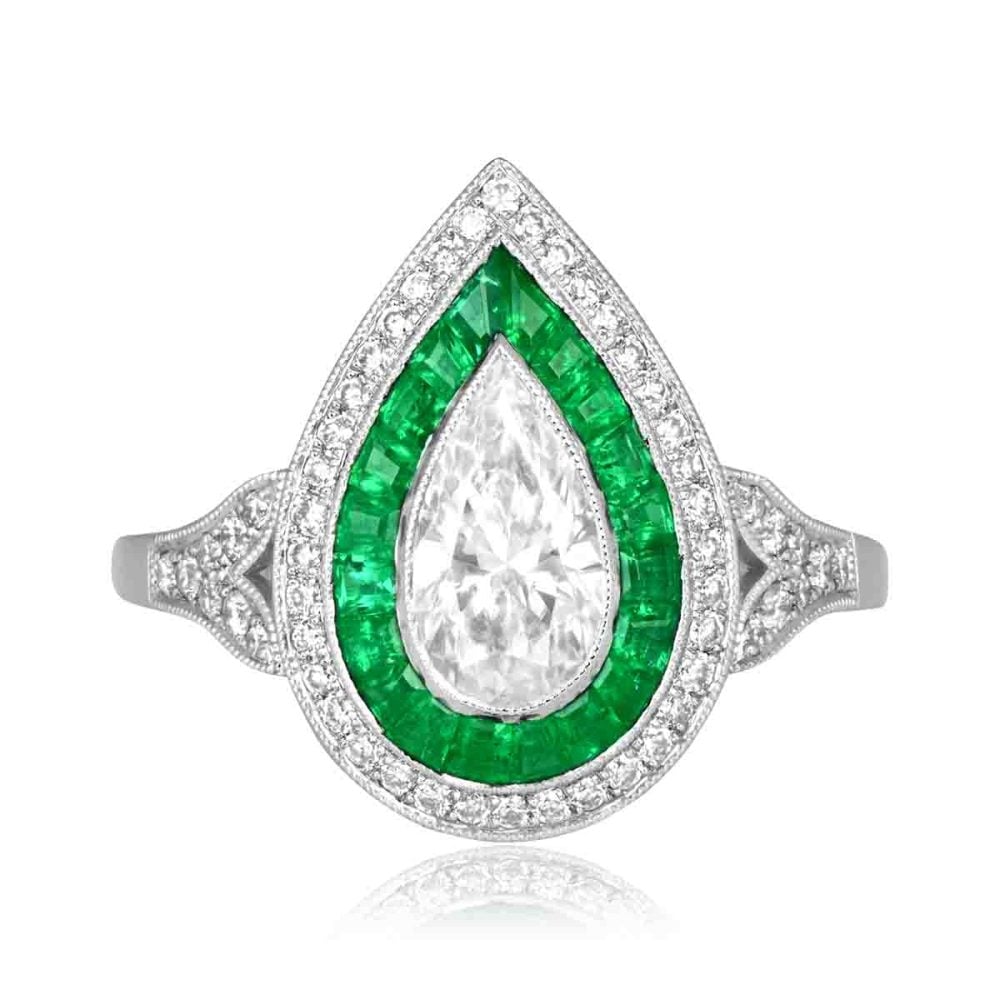 This ring features a GIA certified 0.81 carat pear shaped diamond center stone with a beautiful D color and VVS2 clarity. Surrounding the center diamond is a double halo of emerald and diamond stones. Additional diamonds are set along the shoulders with milgrain detailing. The emerald stones weigh a total of approximately 0.46 carats and the additional diamonds weigh a total of approximately 0.56 carats. This ring is crafted in platinum.