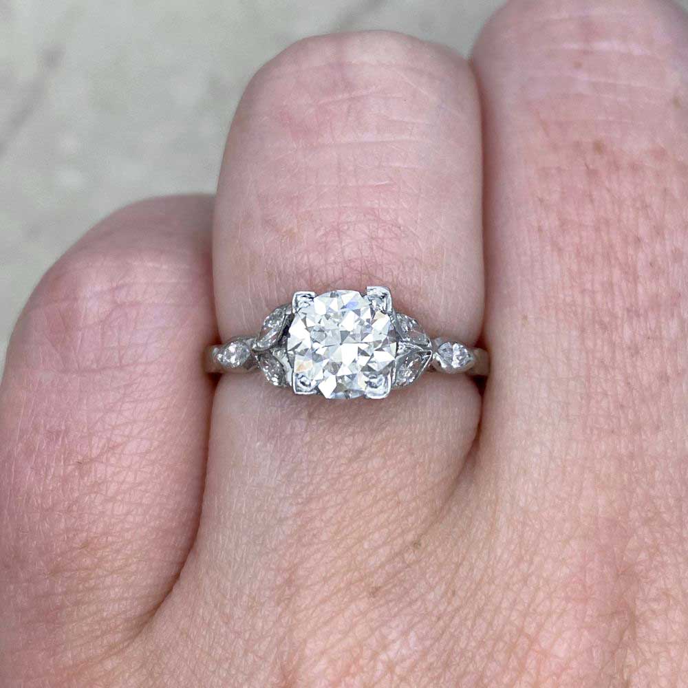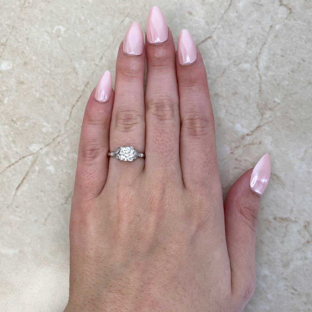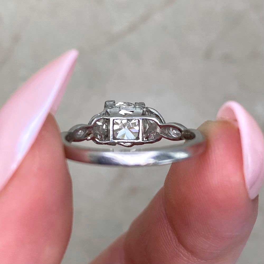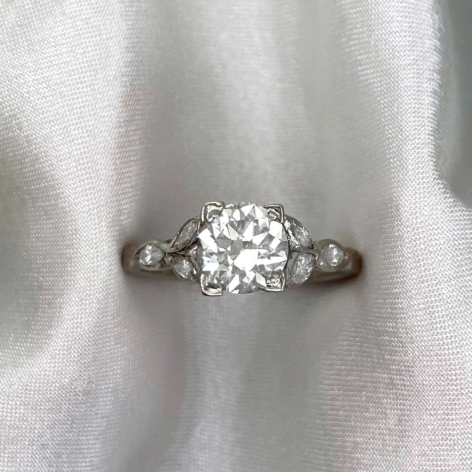 A Word from the Jeweler: The art deco design brings together bold geometry with the graceful, leaf marquise diamonds on the shoulders. The balance between the center diamond and these side details gives it a refined elegance that feels timeless.