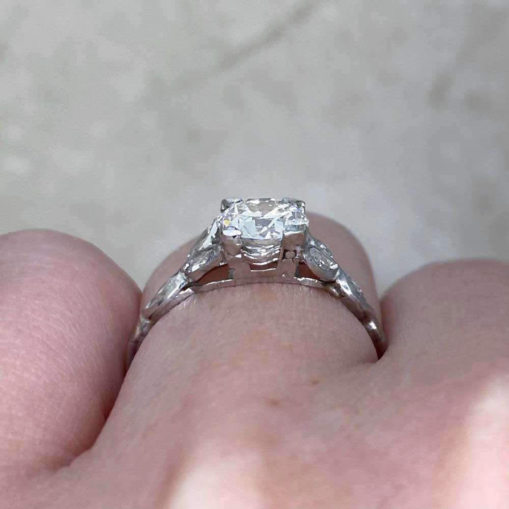 A beautiful Vintage ring featuring a 1.01 carat Old European cut center diamond with a J color and VS2 clarity set in a box prong setting. Each shoulder features a leaf-like design of three additional diamonds cut in a marquise shape and set in a bezel setting. This ring was handcrafted in 18k white gold, circa 1950.