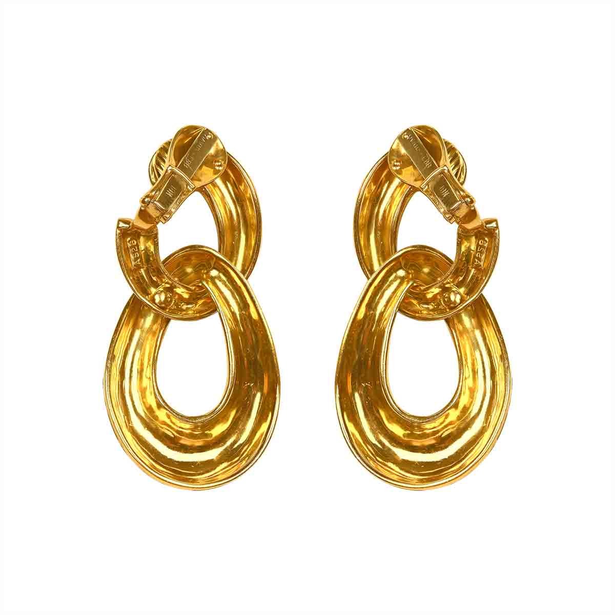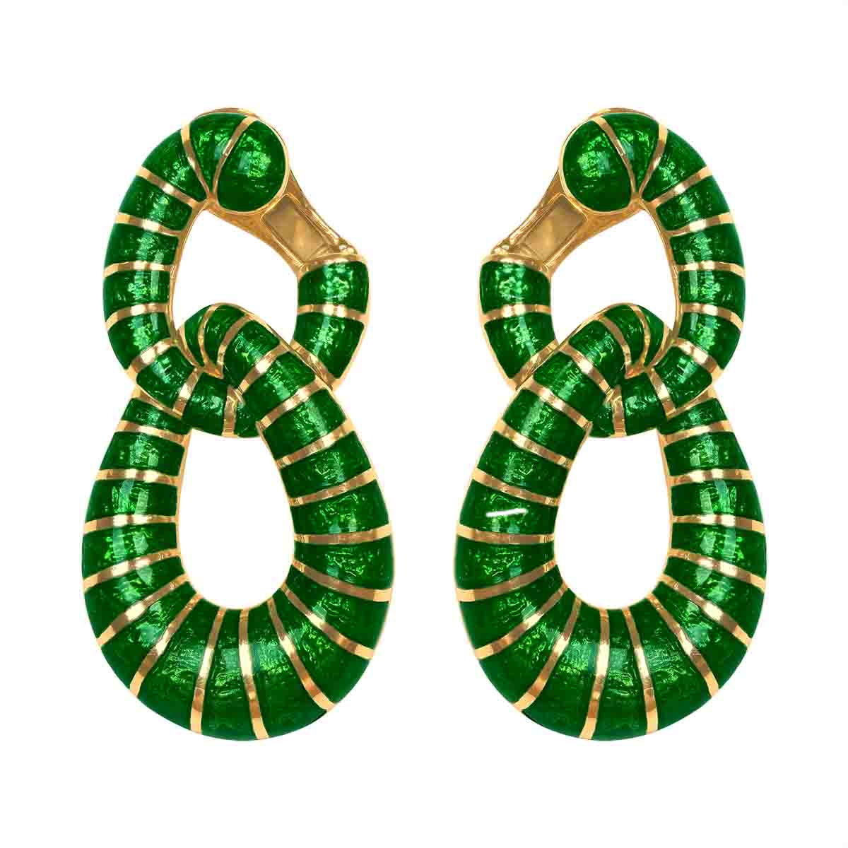 A stunning pair of David Webb earrings featuring an oval chain design. The earrings highlight a unique striped pattern of enameled green and yellow gold throughout the two-linked structure. These earrings are made in 18k yellow gold and signed David Webb, circa 1980.