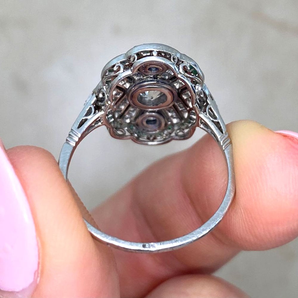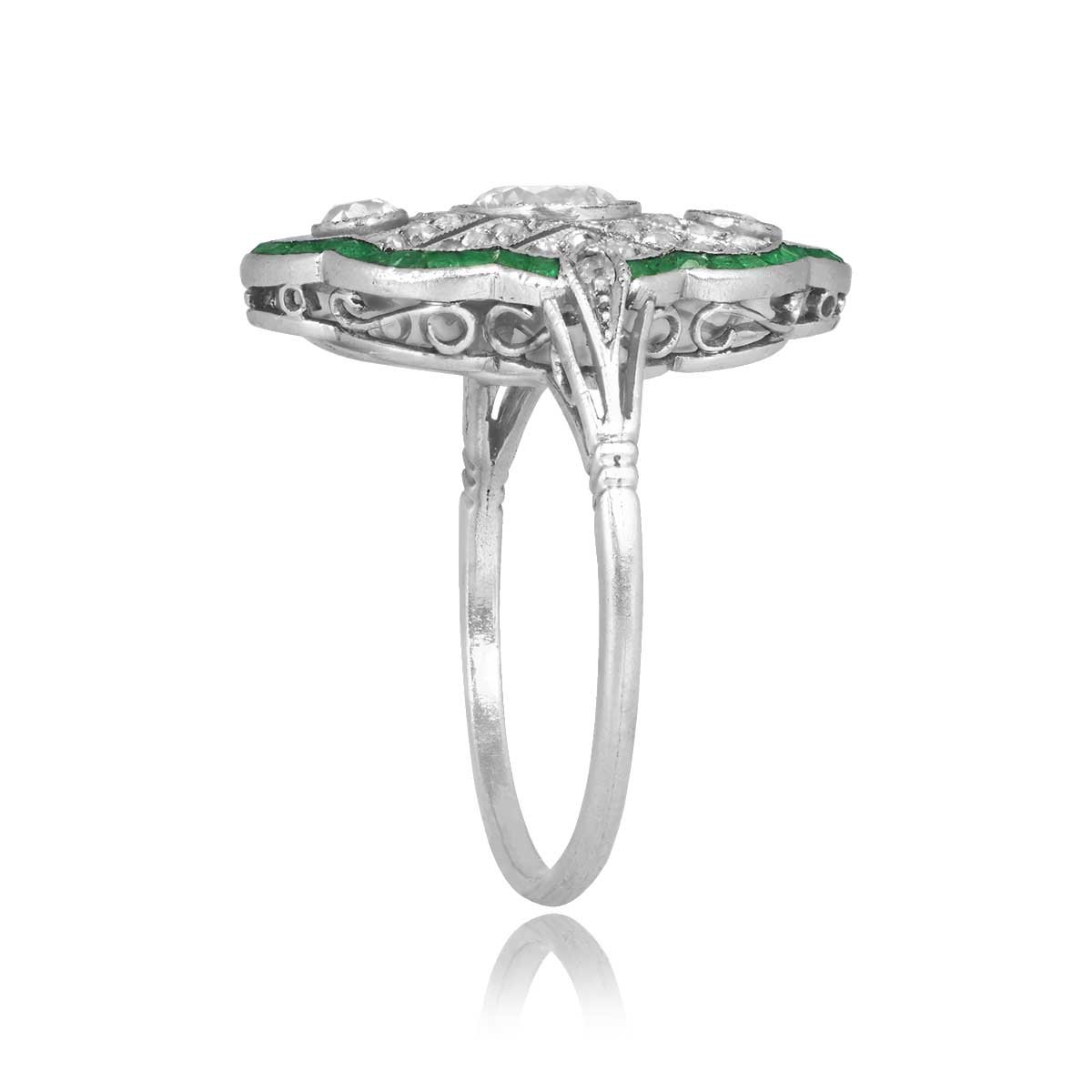 A stunning Edwardian Era ring centering a bezel-set 0.59 carat old European cut diamond with an I color and VS2 clarity. Surrounding the center diamond is an elongated filigree adorned with diamonds and a halo of channel-set emeralds in a scalloped design. Two additional diamonds are bezel-set on the north and south sides of the filigree work weighing a total of 0.20 carats. The total additional diamond weight is approximately 0.48 carats. This ring was handcrafted in platinum, circa 1905.