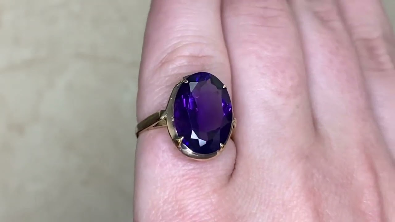 This ring features a stunning 5 carat oval cut deep-purple amethyst in prongs. This amethyst is accented by an openwork gallery and is mounted in 18k yellow gold.