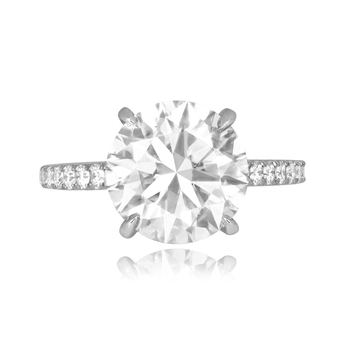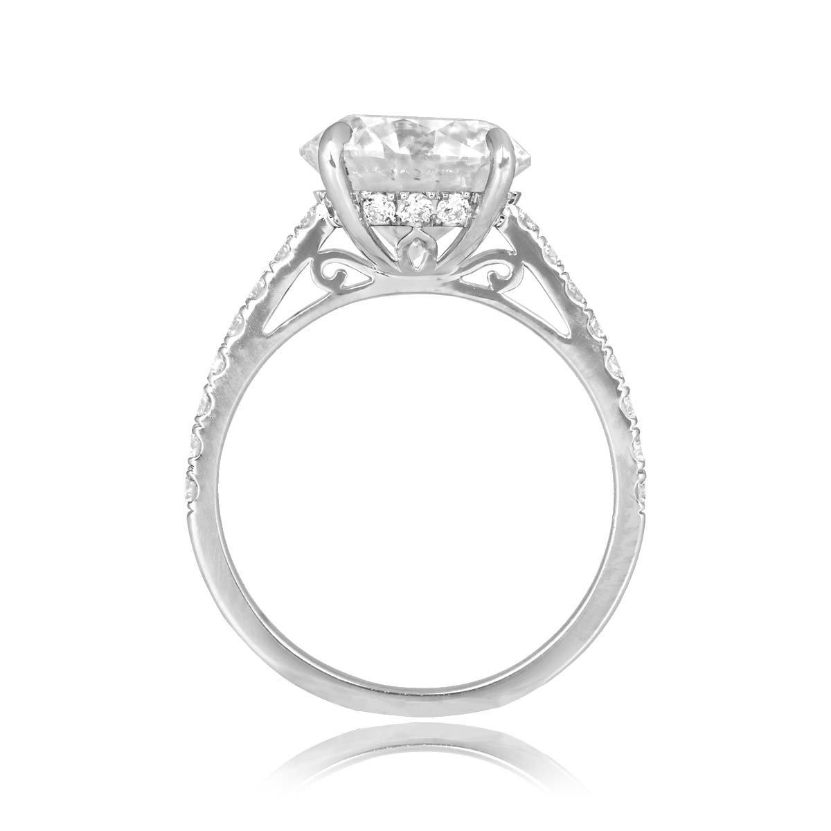 A beautiful ring featuring a GIA certified 4.01 carat round brilliant center diamond with an H color and SI2 clarity. The under-gallery of the ring is decorated with a hidden halo of diamonds and a scroll motifs. Additional diamonds adorn the shoulders. The total additional diamond weight is approximately 0.43 carats. This ring is made in platinum.