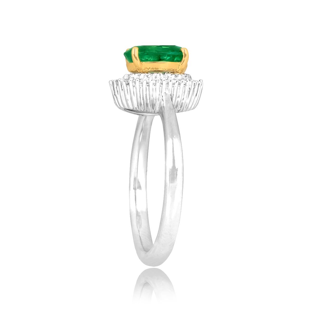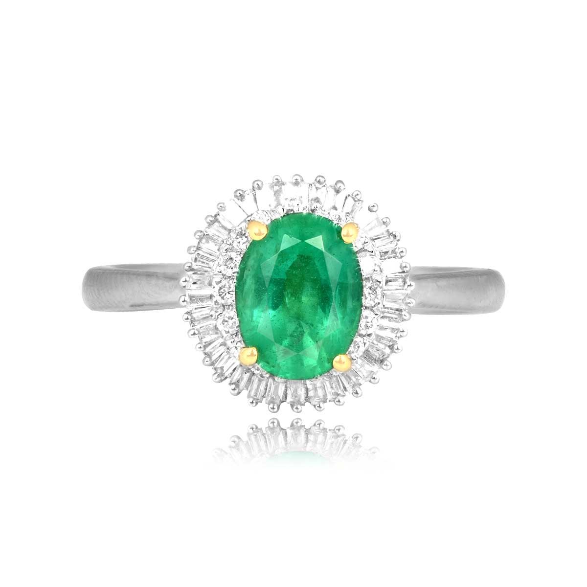 This ring centers a 1.20 carat oval-cut emerald stone set in prongs. Surrounding the center emerald is a double halo of round and baguette cut diamonds. The diamonds weigh a total of 0.25 carats. This ring was made in platinum and 18k yellow gold.