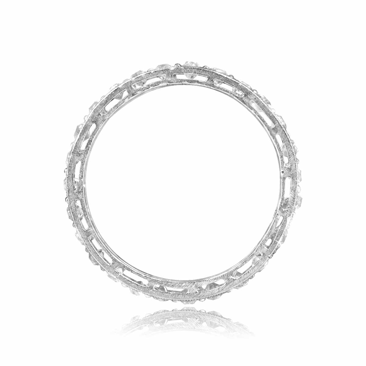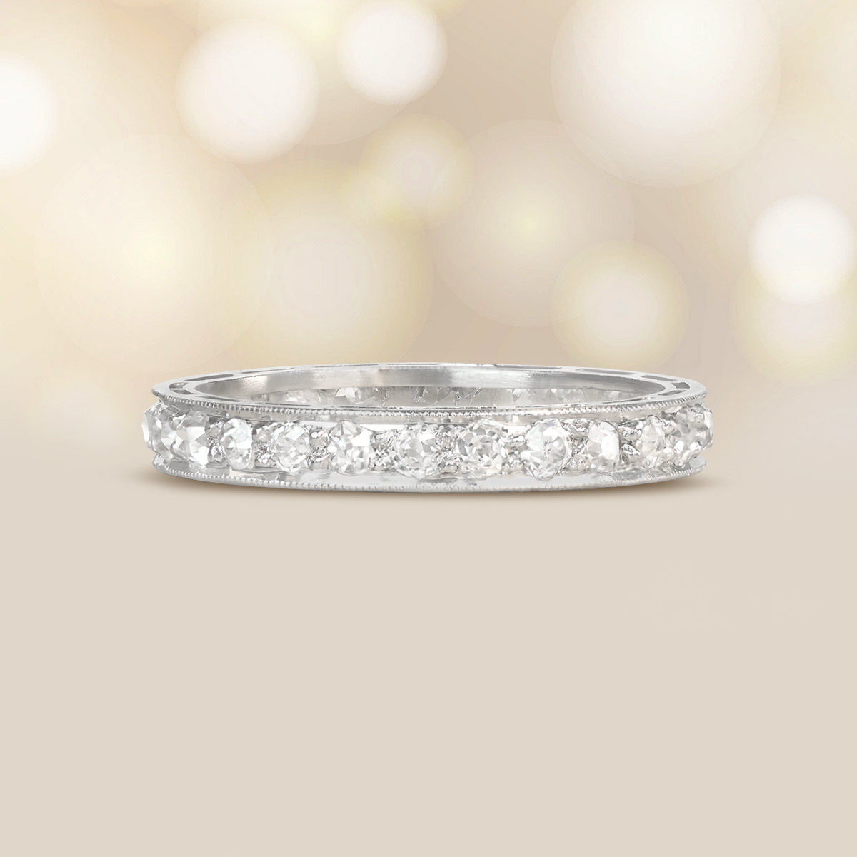 An Art Deco wedding band, with an eternity of Old European and single cut diamonds channel-set with milgrain detailing. The diamonds weigh a total of approximately 0.68 carats. This band was handcrafted in platinum, circa 1920.