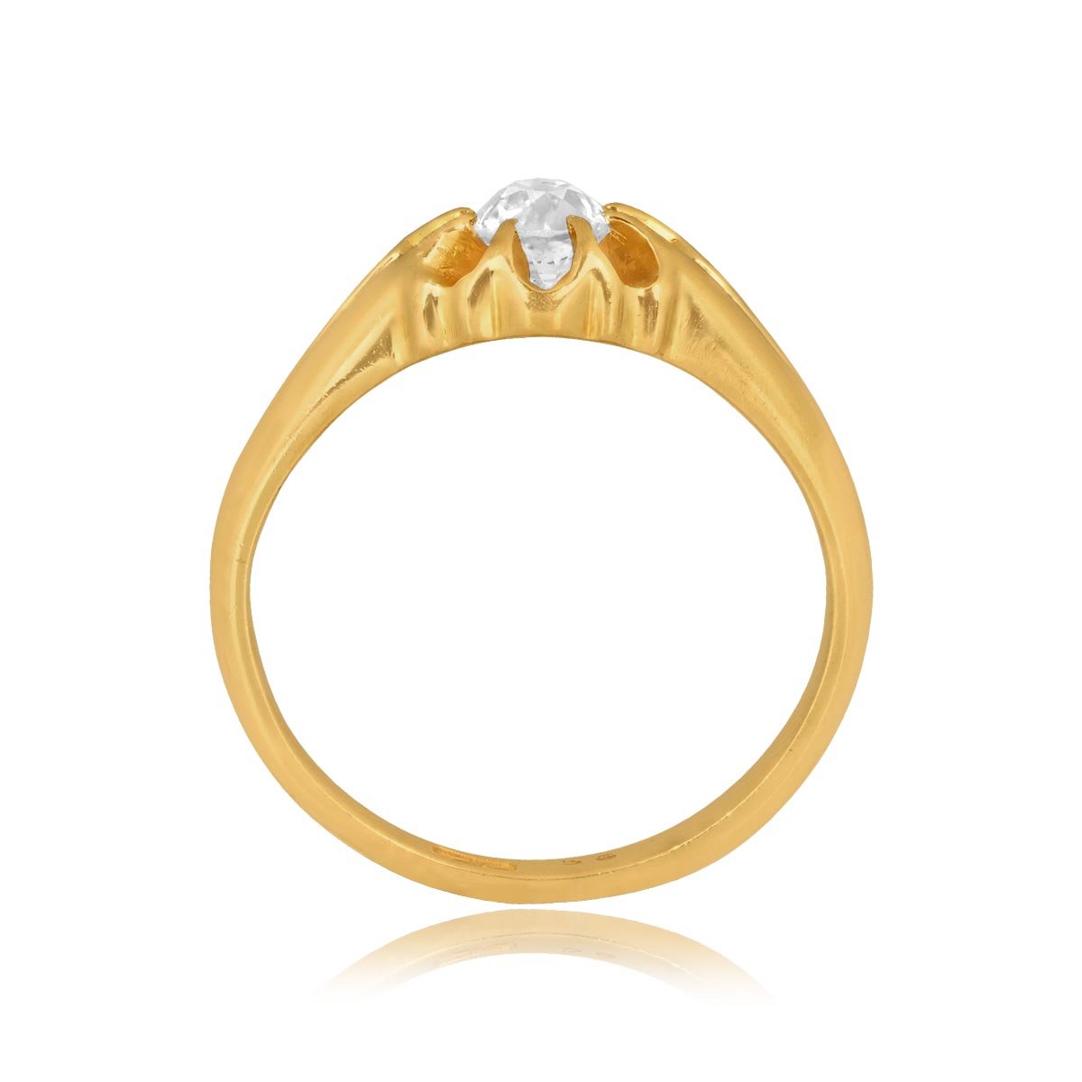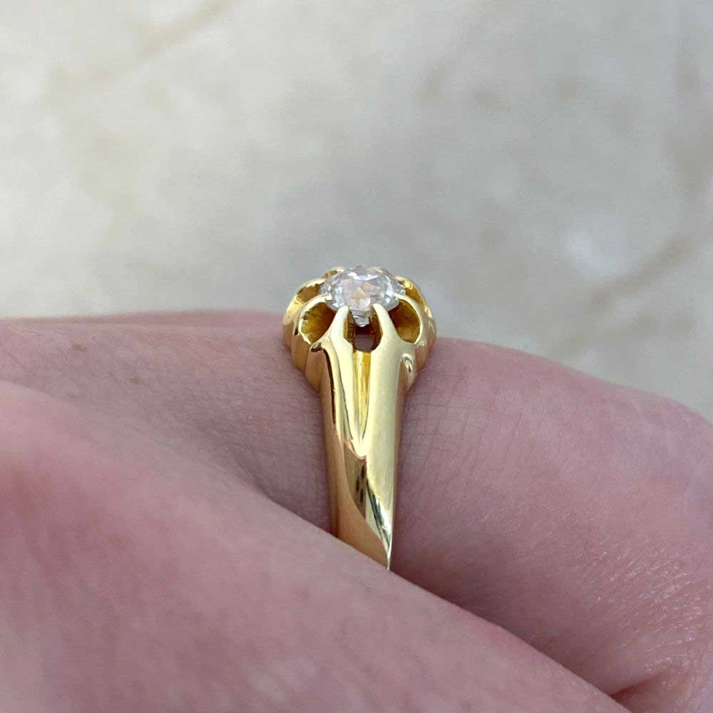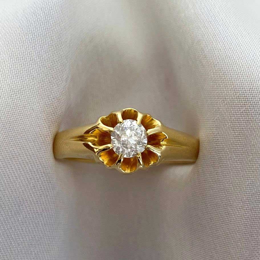 A beautiful 18k yellow gold Victorian Era ring centering a prong-set Old European cut Diamond with an approximate weight of 0.55 carats, an I color and SI2 clarity. The prong setting forms a floral design around the center diamond. This ring was made in England, Circa 1890.