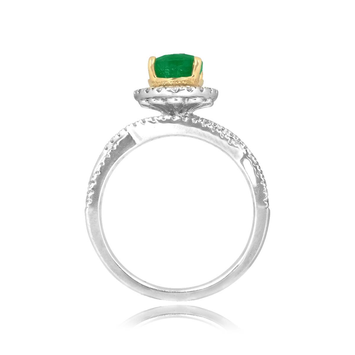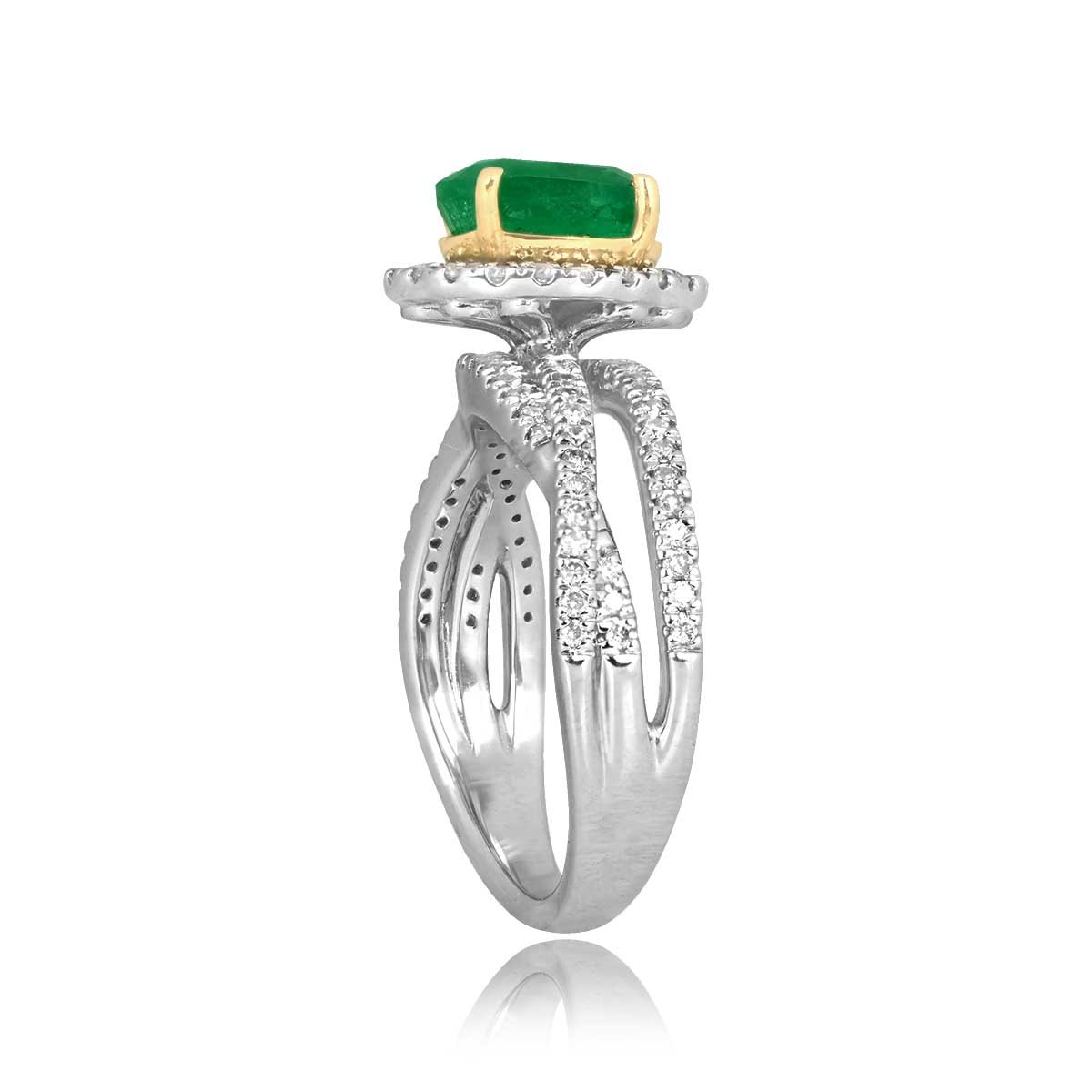 This ring features a 1.00 carat oval-cut emerald center stone set in prongs. Surrounding the emerald is a halo of diamonds leading to a crossover design on the shoulders decorated with additional diamonds. The diamonds weigh a total of 0.50 carats. This ring was made in platinum and 18k yellow gold.