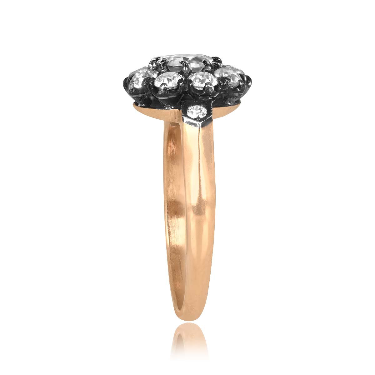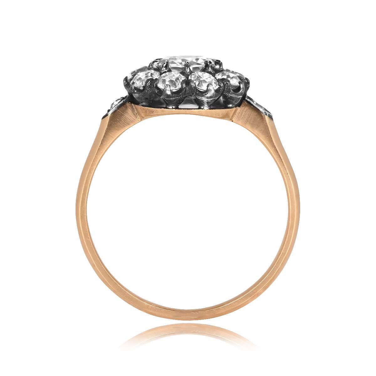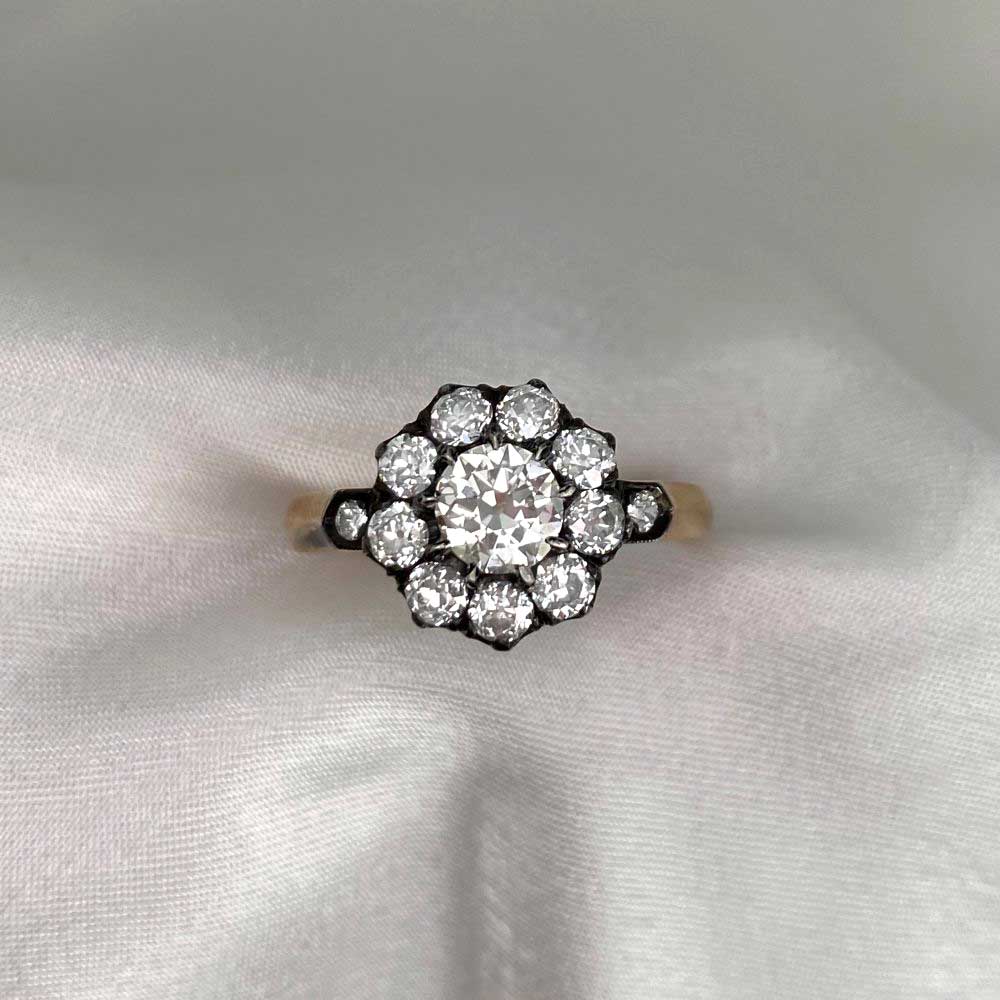 A Word from the Jeweler: I’m always drawn to the contrast of silver over yellow gold which gives the entire setting a softness that makes the stones pop. We chose this cluster ring because it captures that classic antique profile collectors are always asking about.