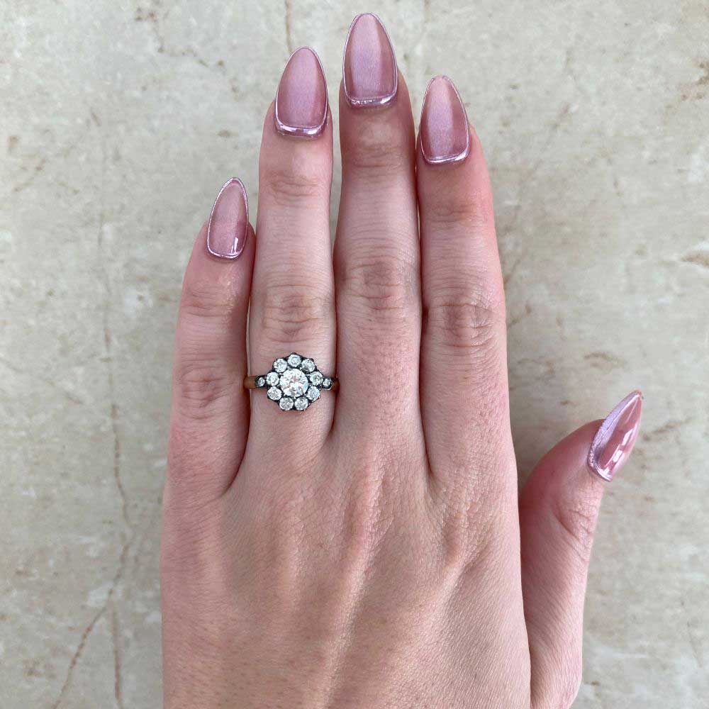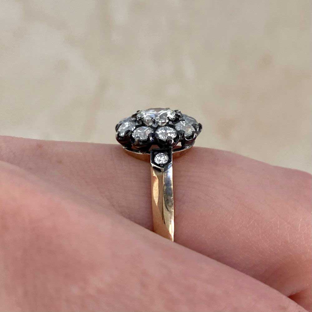 This diamond cluster ring features an old European cut diamond, set in prongs and weighing 0.51 carats, J color, VS1. Surrounding the center stone is a halo of old European cut diamonds in a floral design. Two additional diamond adorn the shoulders. This ring was hand-crafted in silver on 18k yellow gold.