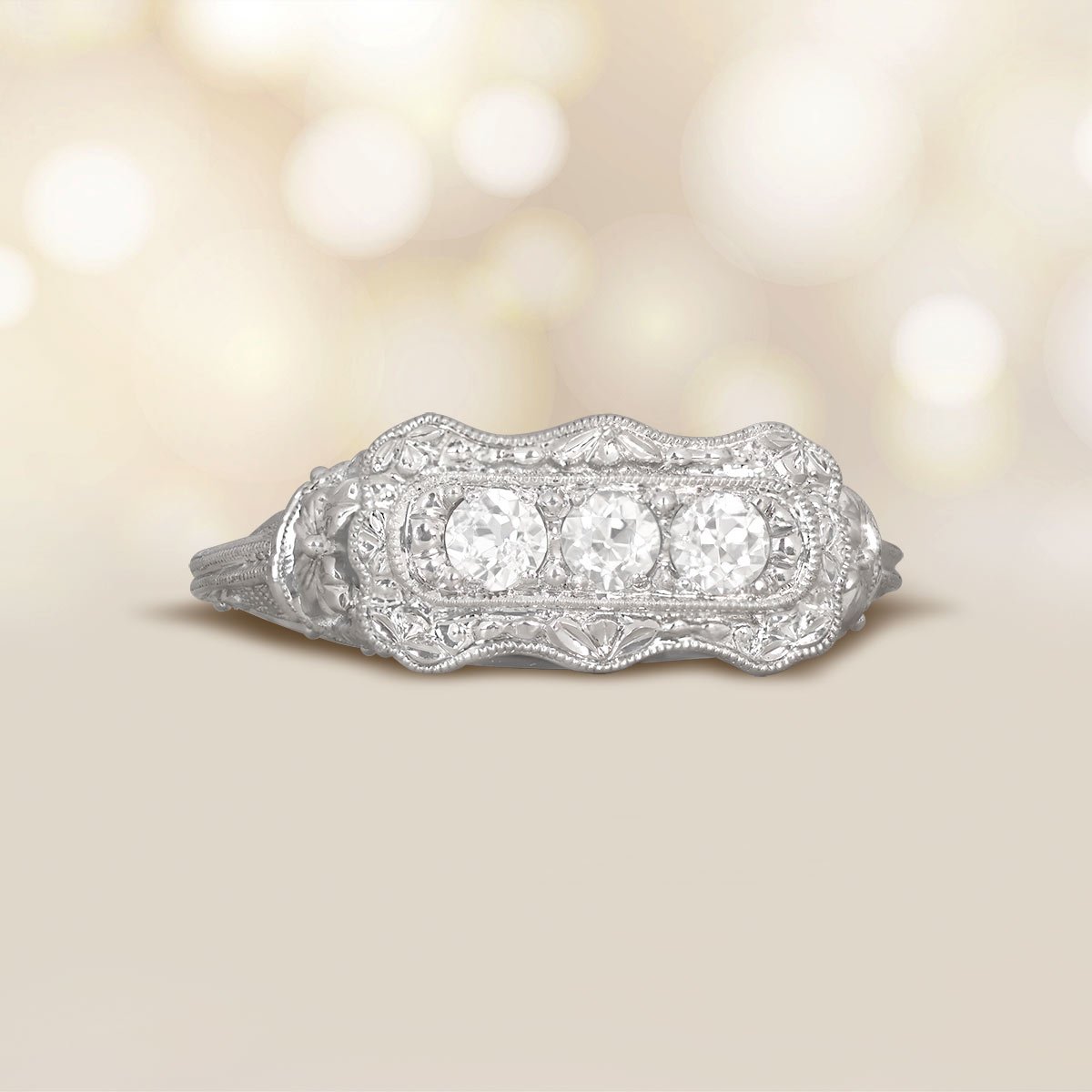 Home / Shop Estate Jewelry Collection / Vintage Engagement Rings / Old European Cut Three-Stone Diamond Filigree Foster Ring