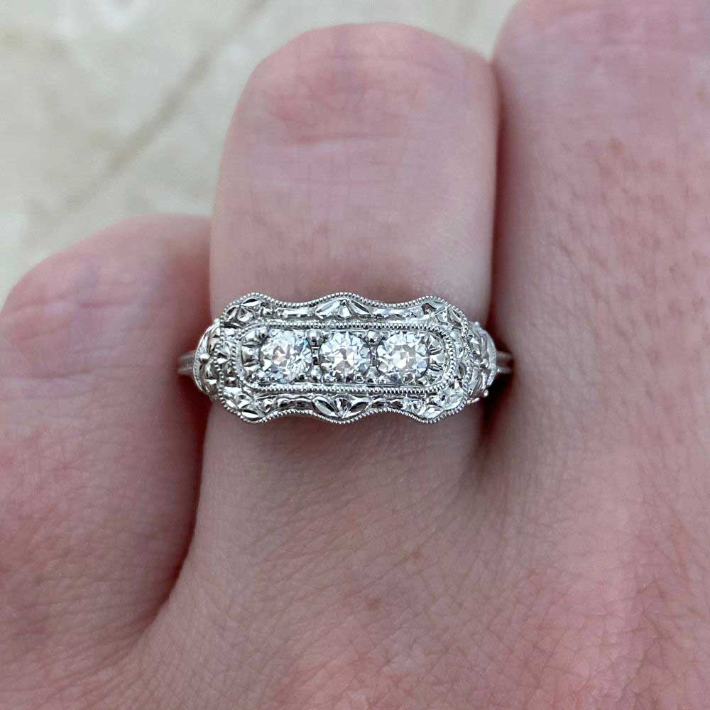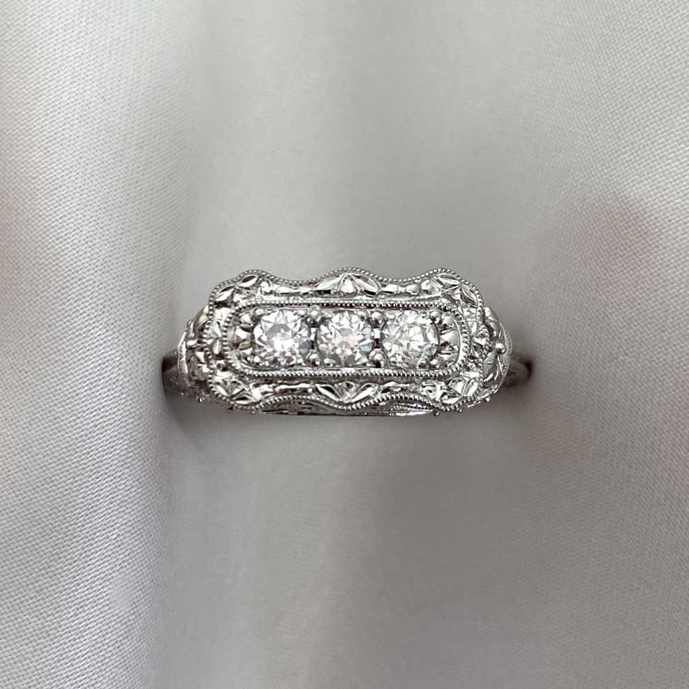 A stunning three-stone ring featuring old European cut diamonds weighting a total of 0.33 carats. Surrounding the center diamonds is a scalloped filigree design showcasing intricate patterns and motifs that continue onto the ring’s shoulders and under-gallery. This ring was handcrafted in platinum.
