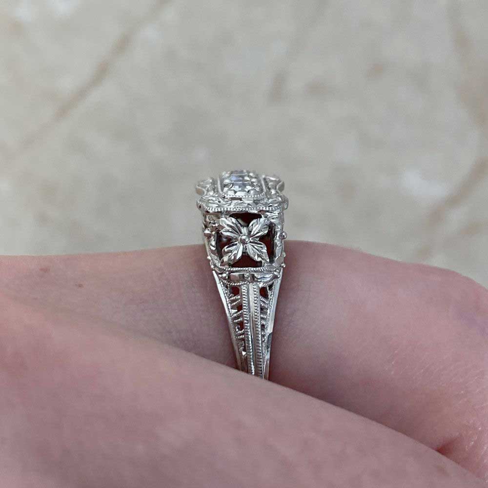 A Word from the Jeweler: The east-west layout gives this traditional three-stone ring a more refined, tailored feel. The filigree work throughout shows an impressive level of craftsmanship that’s hard to come by today.