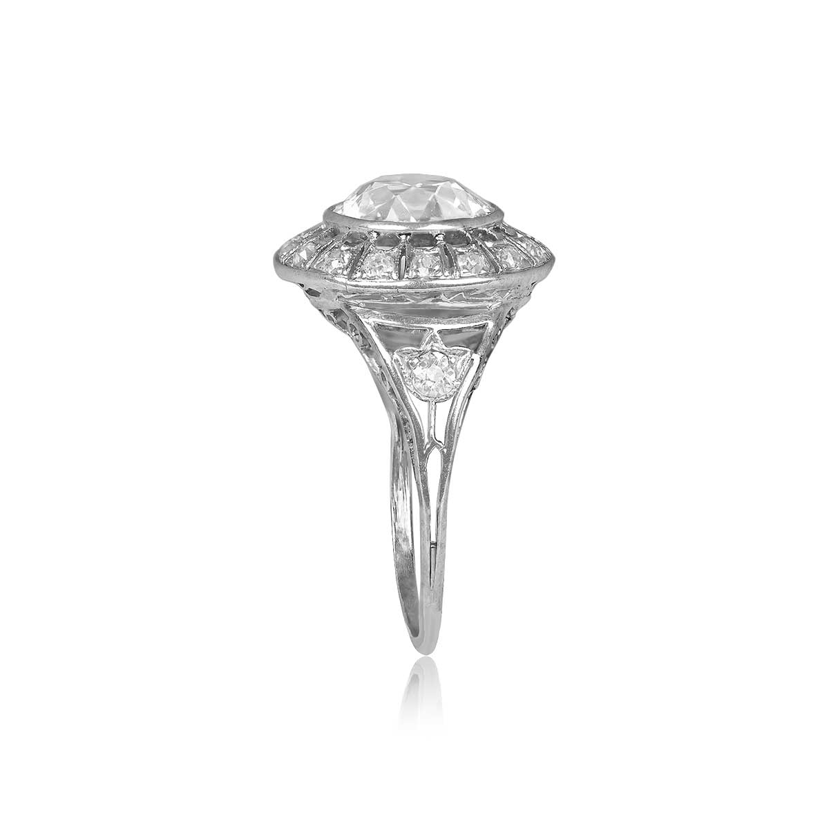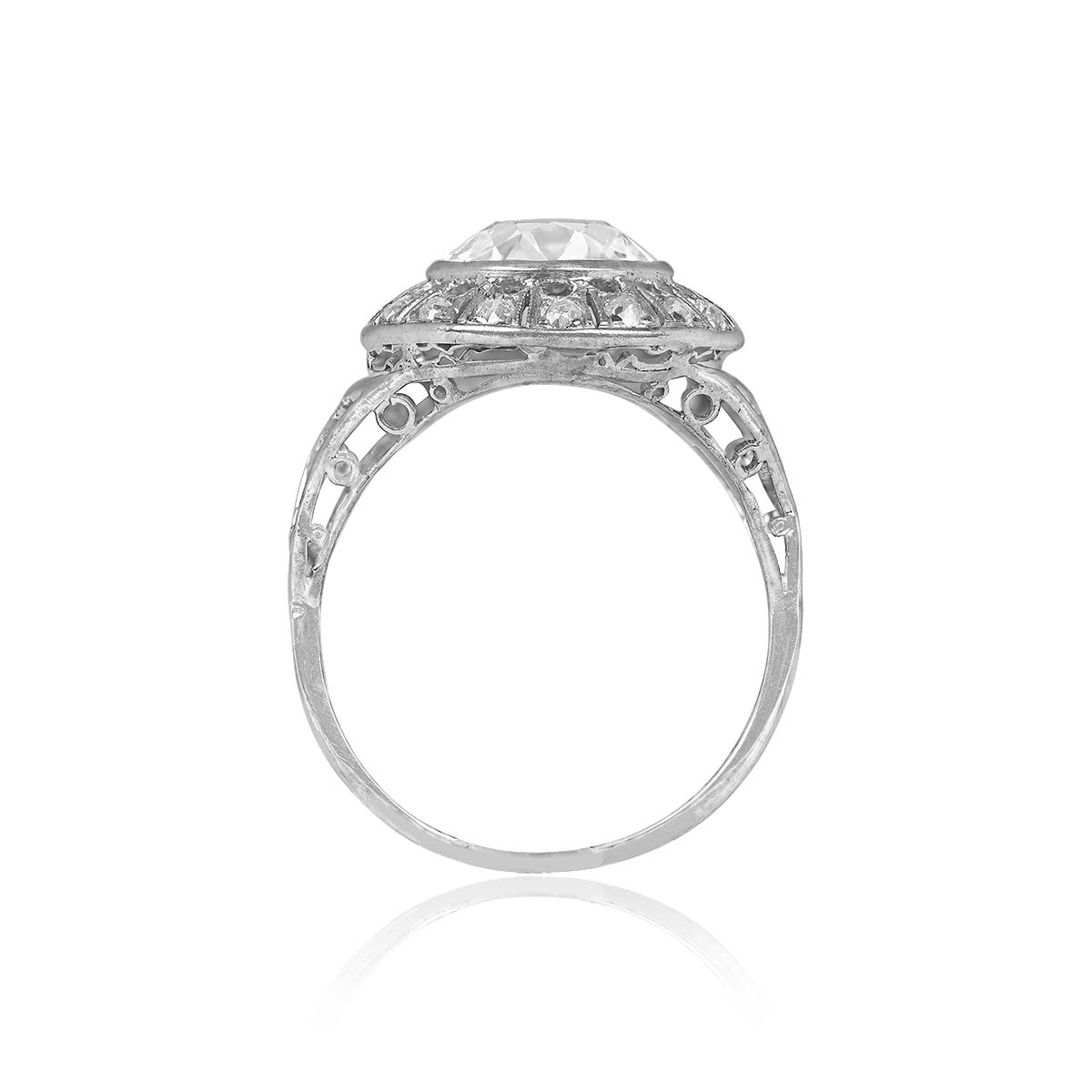 A stunning antique engagement ring featuring an GIA-certified old European cut diamond center weighing 2.25 carats, J color and VS1 clarity. Surrounding the center stone is a floral design and a halo of pave-set old European cut diamonds. Adorning the shoulders is an additional old European cut diamond on each side set in a floral motif. The total weight of the additional diamonds is approximately 0.40 carats. An openwork under-gallery decorates the platinum mounting. This ring was handcrafted during the Edwardian era, circa 1910.