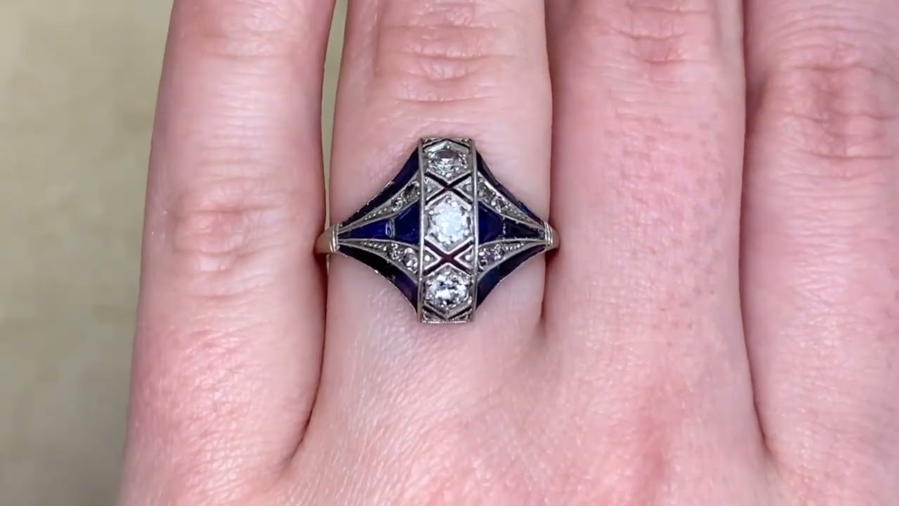 This antique engagement ring features a vertical row of three old European cut diamonds. Accenting the center diamonds on each side are graduating layers of diamonds and synthetic sapphires. The total approximate weight of the diamonds is 0.53 carats. This ring was handcrafted in platinum during the Art Deco era, circa 1920.