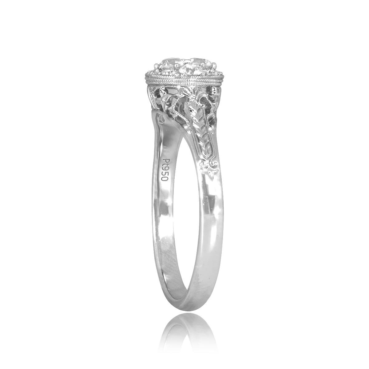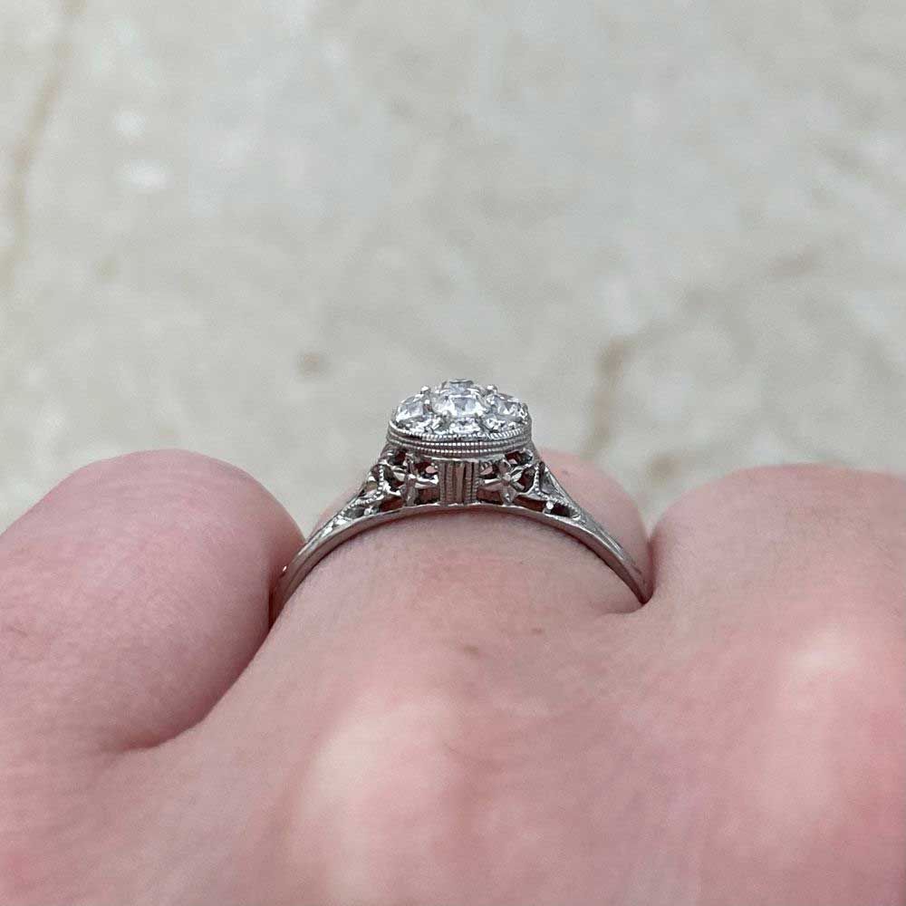 A beautiful ring featuring a center diamond cluster weighing a total of 0.38 carats set in a shared prong setting. An oval bezel setting with milgrain detailing surrounds the center cluster. The under-gallery and shoulders of the ring are decorated with an openwork filigree design. This ring was handcrafted in platinum.