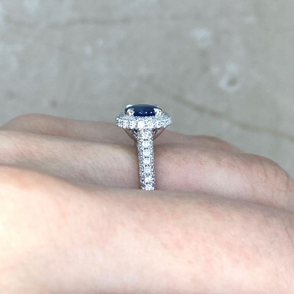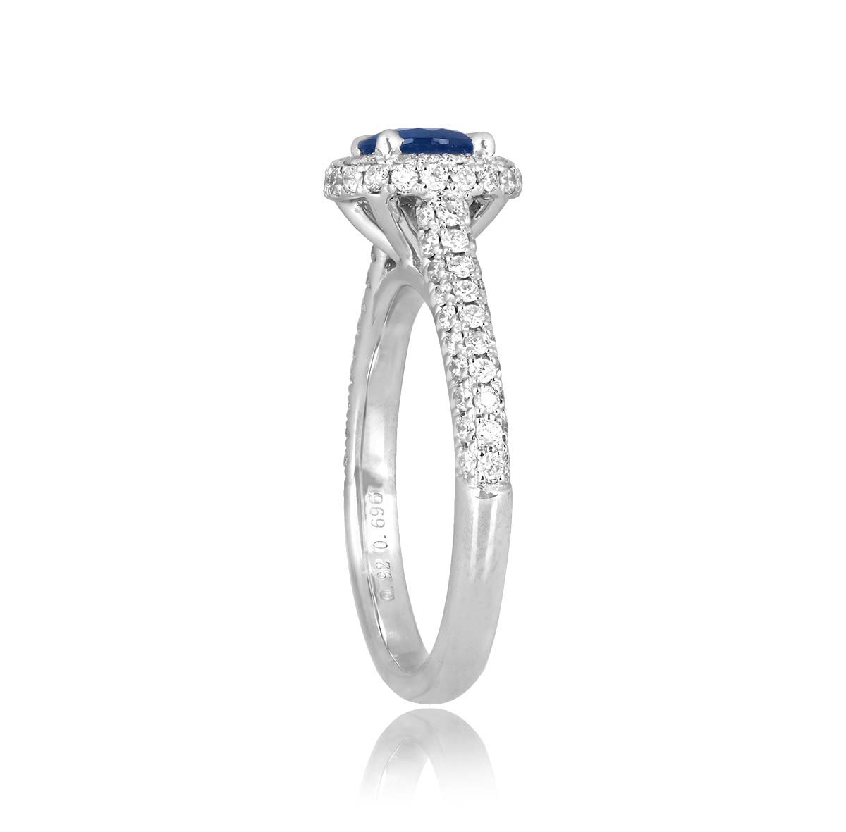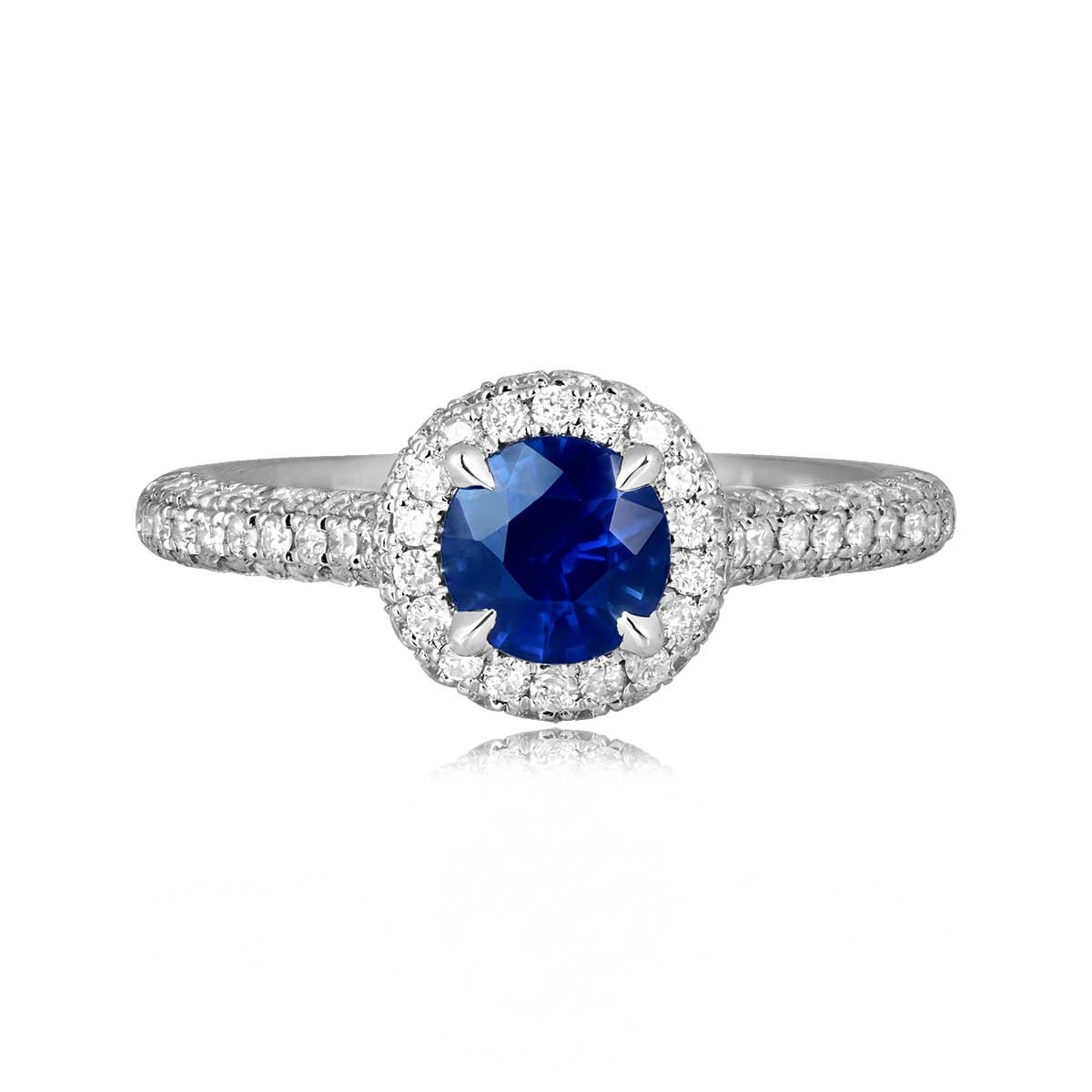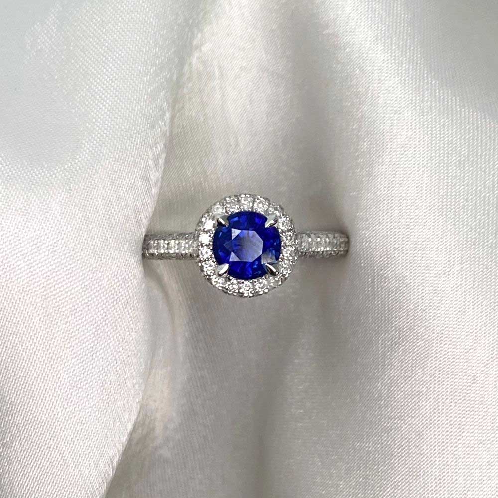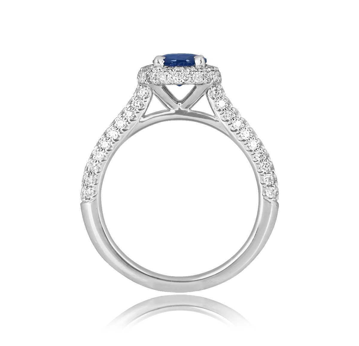 A Word from the Jeweler: I love how the round sapphire stands out with the surrounding diamond halo, giving it such a timeless look. The diamonds flowing onto the shoulders add just the right touch of elegance that makes this ring so special.