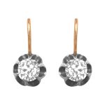 These Victorian era earrings center two old mine cut diamonds with an L color VS2 clarity set in floral prong designs. The diamonds weigh a total of approximately 1.80 carats. These earrings were handcrafted in silver on 18k yellow gold, circa 1890.