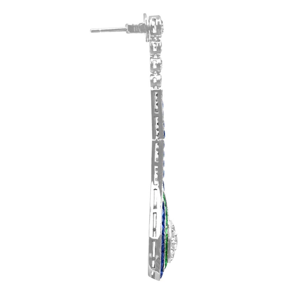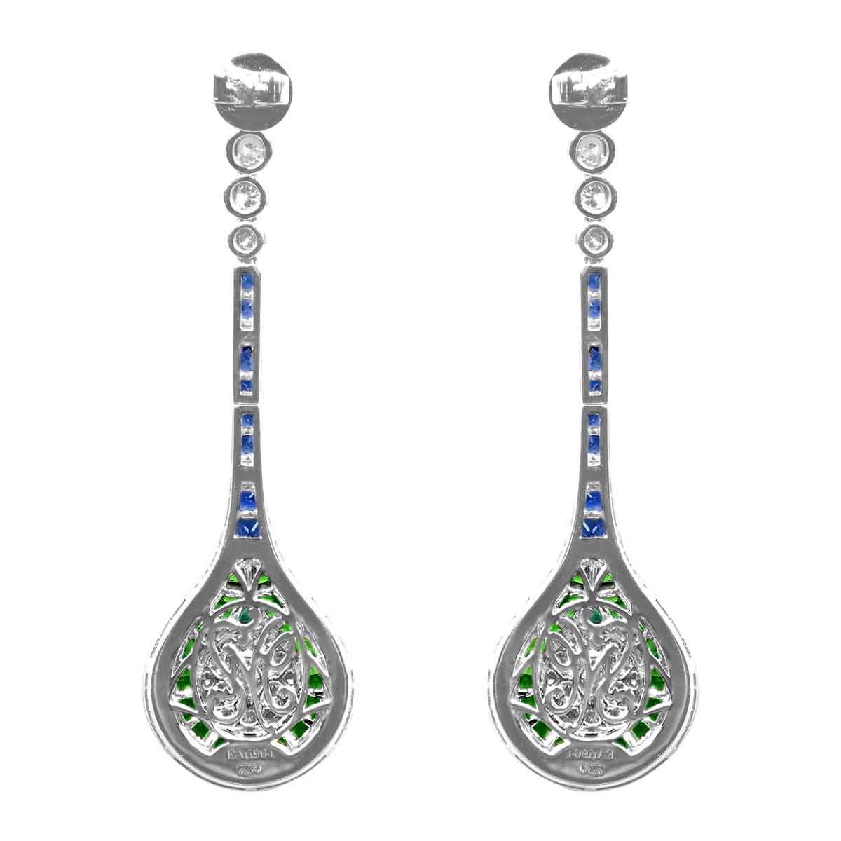 These earrings showcase a unique elongated teardrop design featuring sapphire, tsavorite and diamond stones. Four round diamonds are bezel-set in a tapered design on the top section of the earrings. The sapphire stones weigh a total of 3.62 carats. The tsavorite stones weigh a total of 1.41 carats. The diamonds weigh a total of 1.90 carats. These earrings are made in 18k white gold.