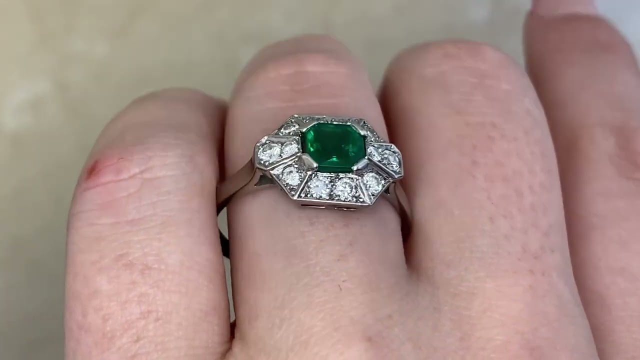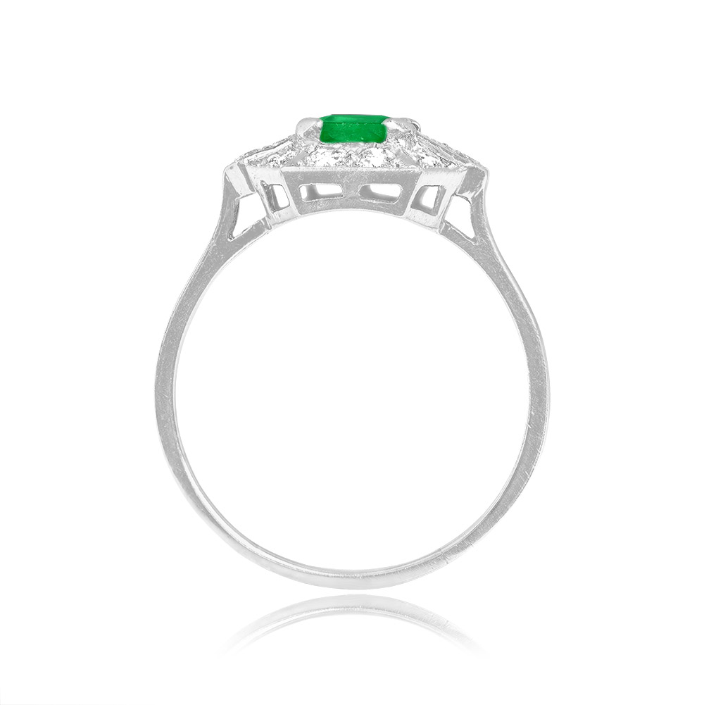 A vintage engagement ring centering an emerald-cut emerald center weighing approximately 0.80 carats. The center is set in prongs and surrounded by a geometric halo of pave-set round brilliant diamonds. The total diamond weight is approximately 0.30 carats. An open work under-gallery decorates the platinum mounting. This ring was handcrafted in the Retro era, circa 1945. This ring is made in France and bears French hallmarks.