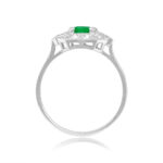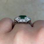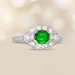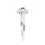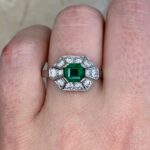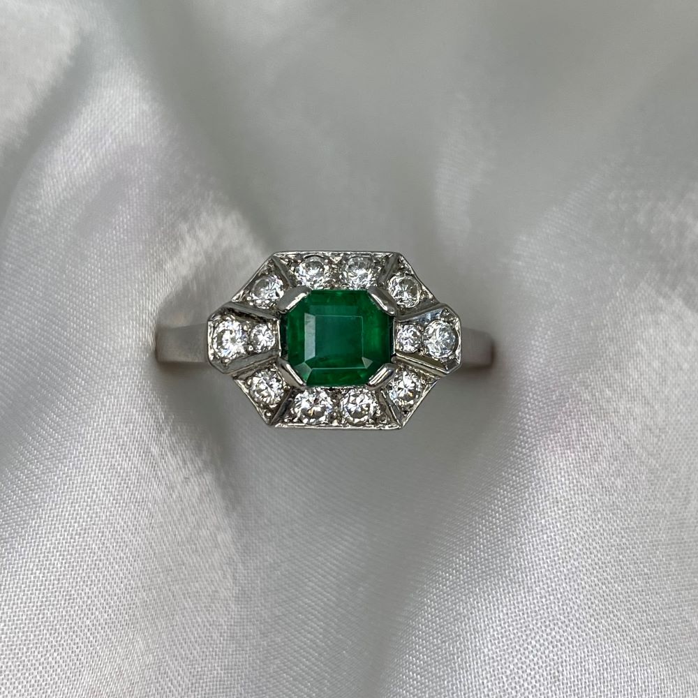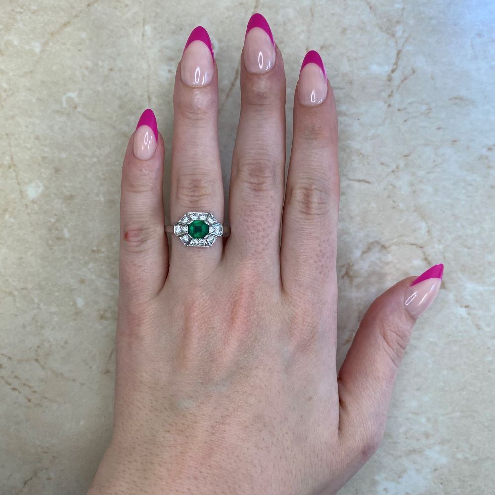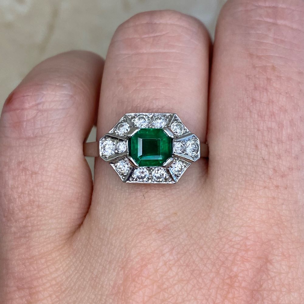 A Word from the Jeweler: This Retro era design stands out with its geometric halo, giving the ring a timeless feel. The emerald adds a beautiful pop of color that complements the bold lines and structure of the setting.