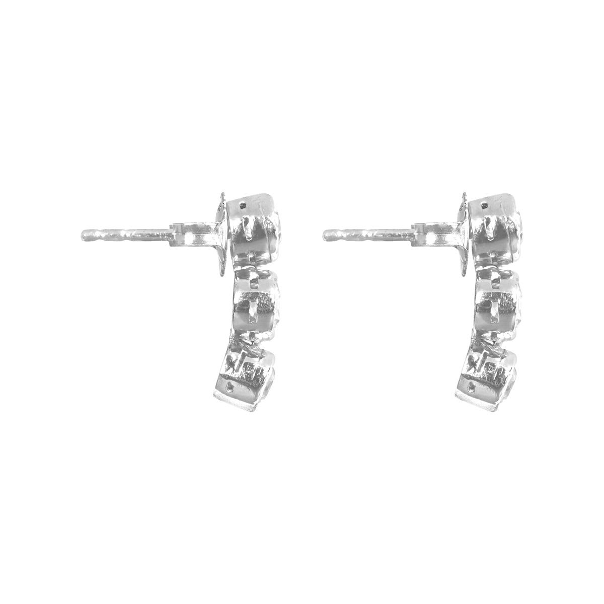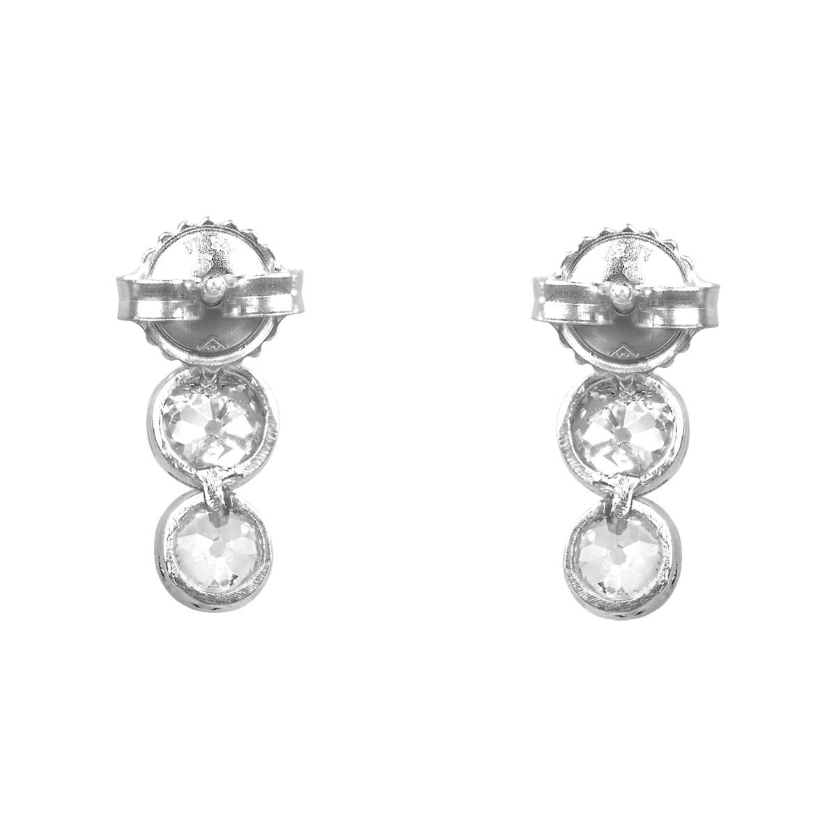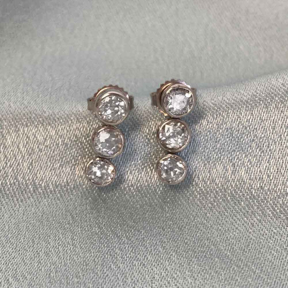 A stunning pair of hanging earrings featuring three old European cut diamonds on each earring. The diamonds are each set in a bezel setting. The diamonds weigh a total of approximately 1.19 carats with a K-L color and SI1-SI2 clarity. These earrings are made in platinum.