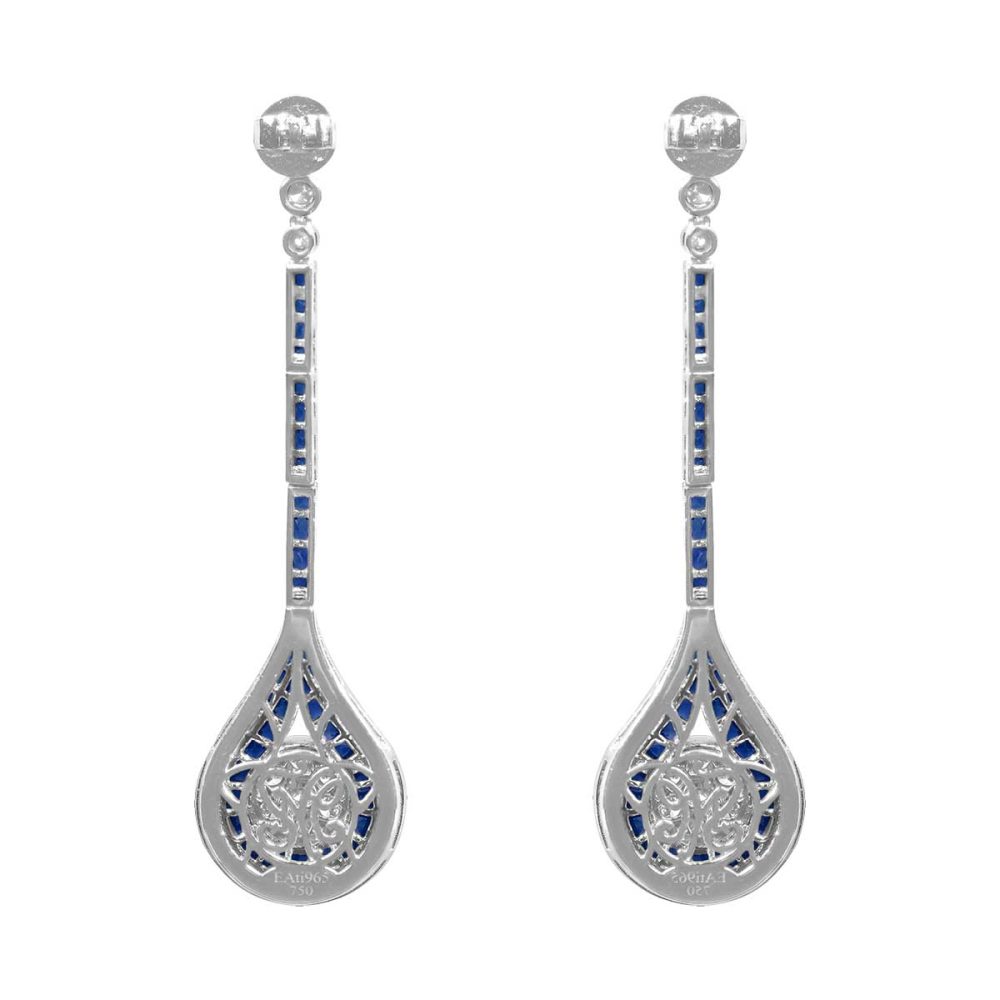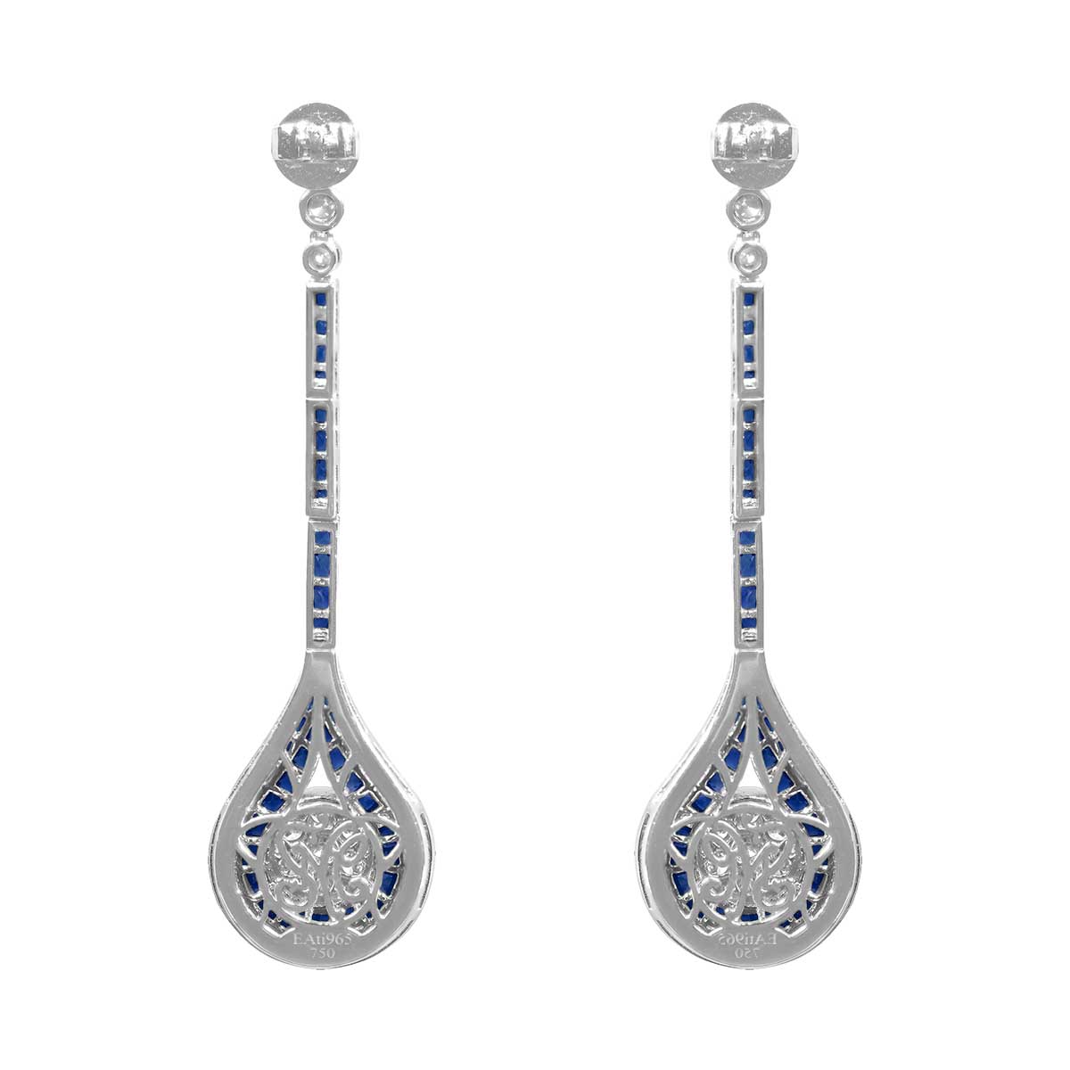 These earrings feature an elongated teardrop design with sapphire and diamond stones. Three bezel-set diamonds decorate the top section of each earring. The diamonds weigh a total of 1.65 carats. The sapphires weigh a total of 7.25 carats. These earrings are made in 18k white gold.