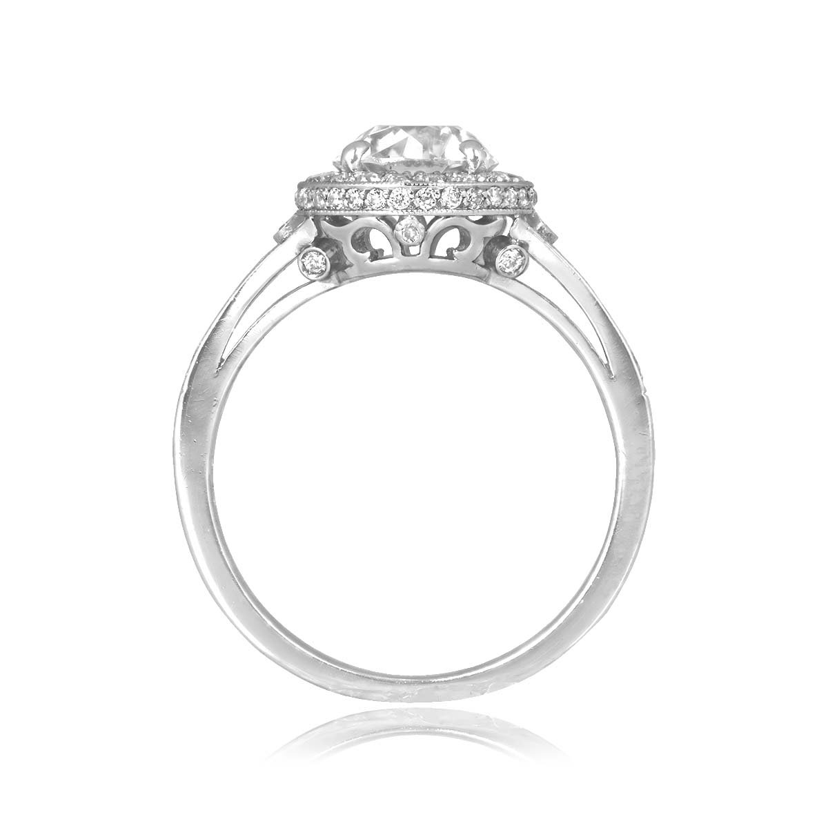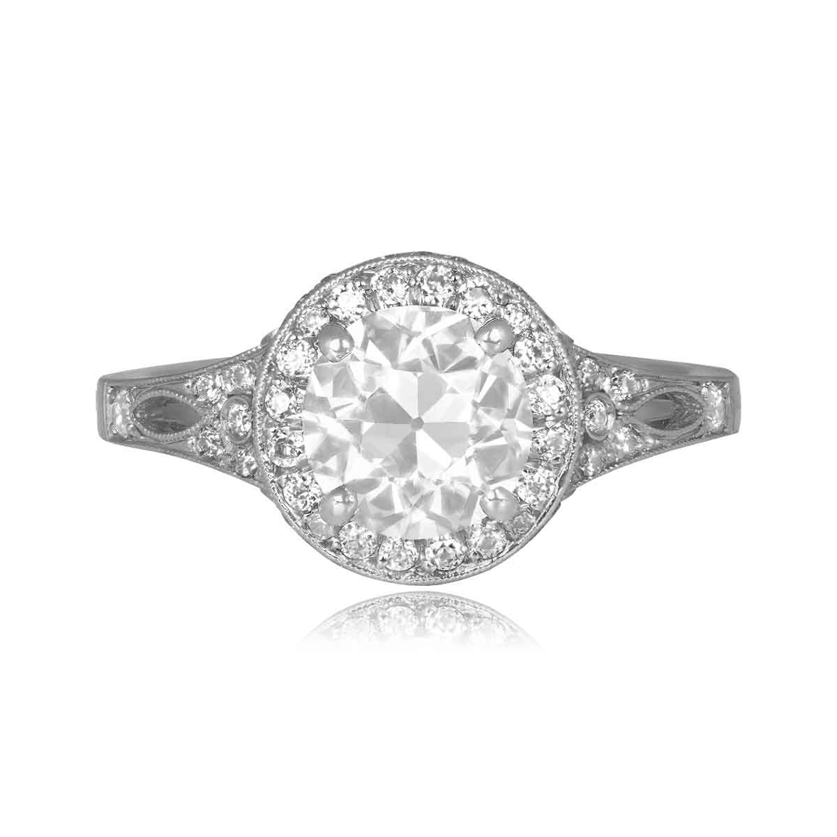 This Art Deco ring centers a GIA certified 1.39 carat old European cut diamond with a J color and SI1 clarity. A halo of diamonds surround the center stone. The shoulders and under-gallery of this ring feature openwork designs adorned with diamonds and milgrain detailing. The total weight of the additional diamonds is approximately 0.35 carats. This ring was handcrafted in  platinum, circa 1925.
