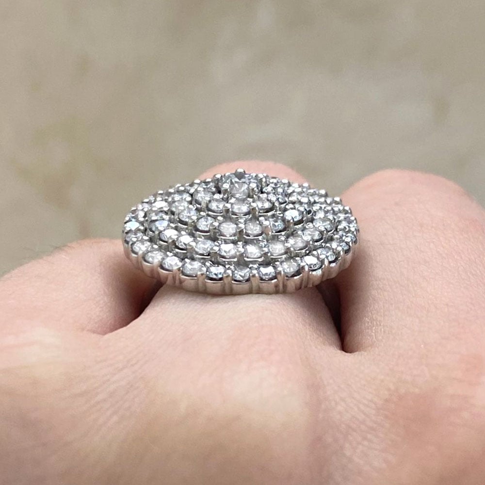The center stone measures 6.94mm x 7.16mm x 4.31mm. The measurements of the ring, including the halo, are 10.10mm x 10.13mm.
