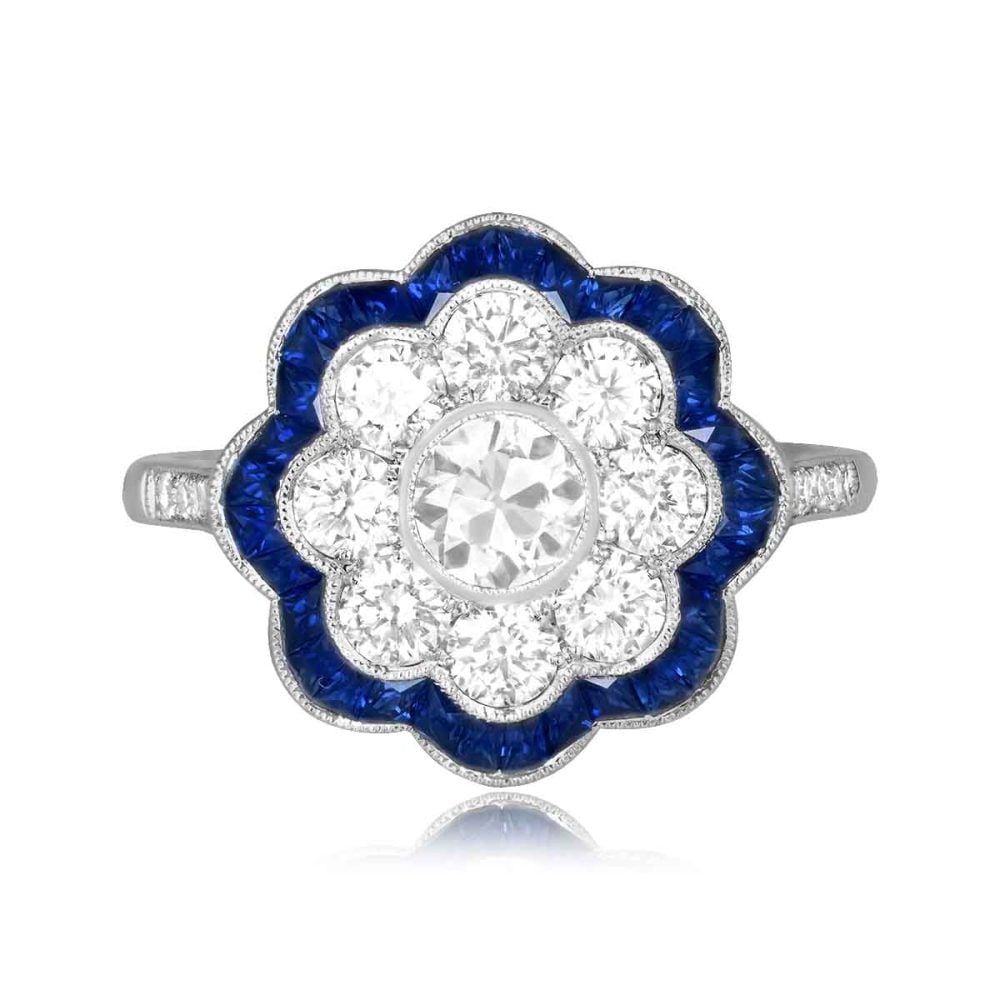 This ring features a beautiful floral design centering a 0.34 carat old European cut diamond set in a bezel setting. Surrounding the center diamond are additional diamonds and sapphire stones. The diamonds have an overall H-I color and VS2 clarity. The additional diamonds weigh a total of 0.72 carats and the sapphire stones weigh a total of 0.70 carats. This ring is crafted in platinum.