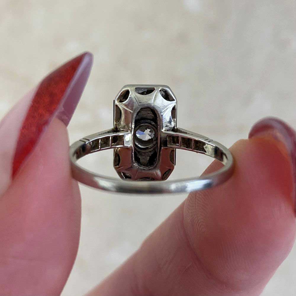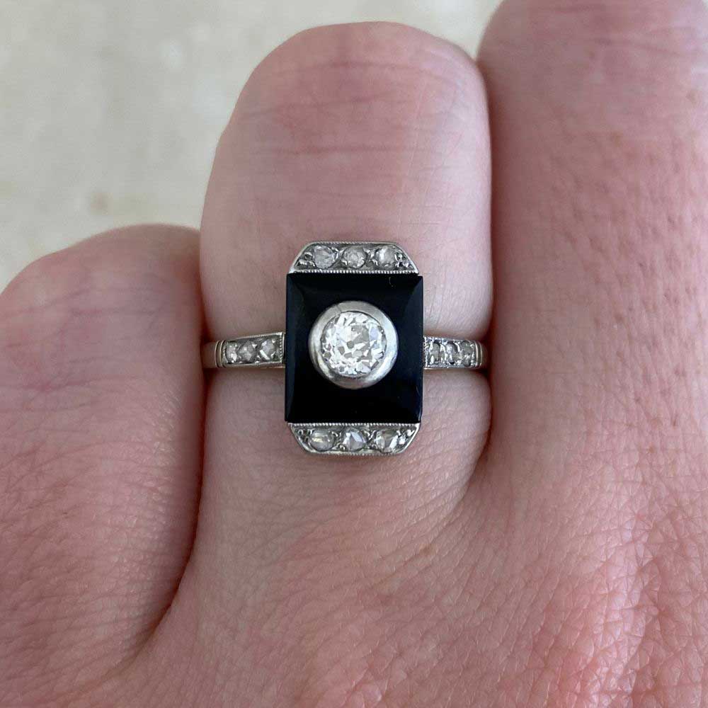 An Art Deco ring featuring a bezel set 0.20 carat old European cut center diamond with a J color and VS2 clarity. A geometric onyx stone surrounds the center diamond with single rose cut diamonds further decorating the north and south side of the ring. Three additional single rose cut diamonds adorn each shoulder. This ring was handcrafted in platinum, circa 1920.