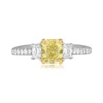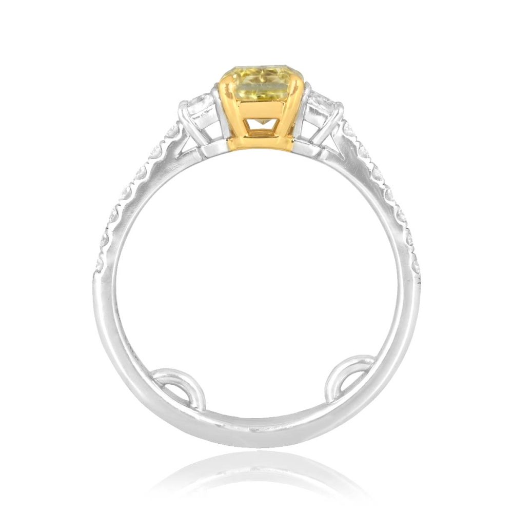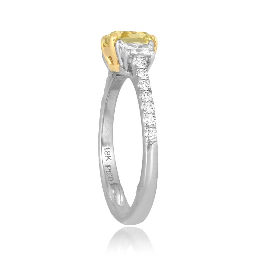 This ring centers a GIA certified 1.41 carat radiant cut diamond with a fancy intense yellow color and VVS2 clarity, set in 18k yellow gold prongs. Accenting the center diamond are two trapezoid shaped diamonds leading to round brilliant diamonds set halfway down the shank. The additional diamonds weigh a total of 0.56 carats. This ring is crafted in platinum.