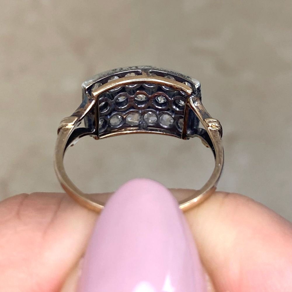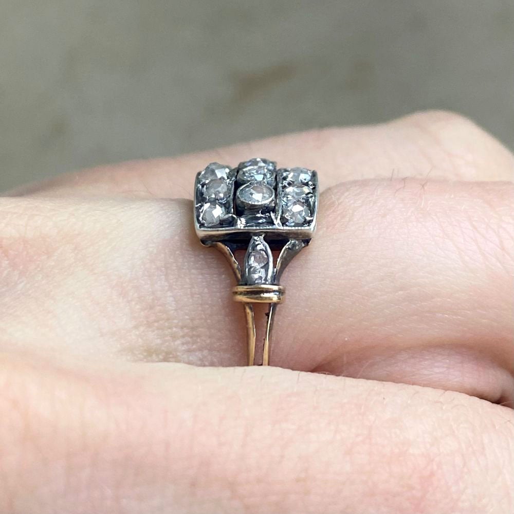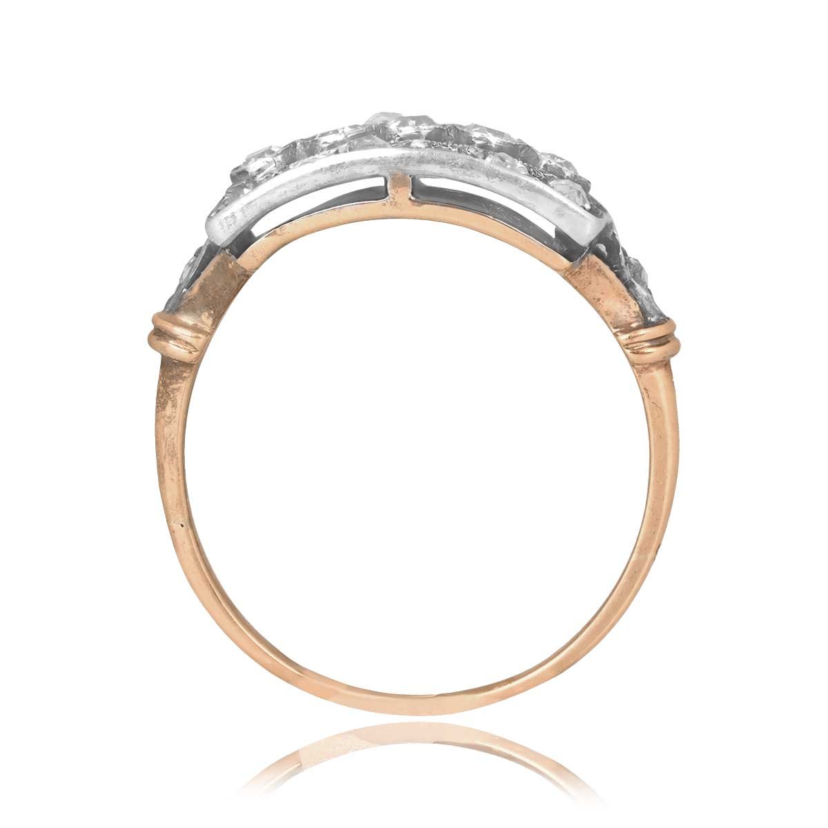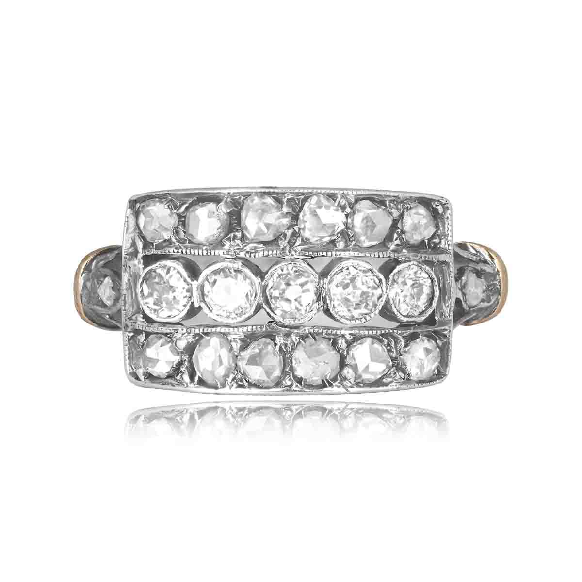 This ring features three rows of old European cut and rose cut diamonds. An openwork design decorates each shoulder of the ring adorned with an additional rose cut diamond. This ring was handcrafted in platinum on 18k yellow gold, circa 1905.
